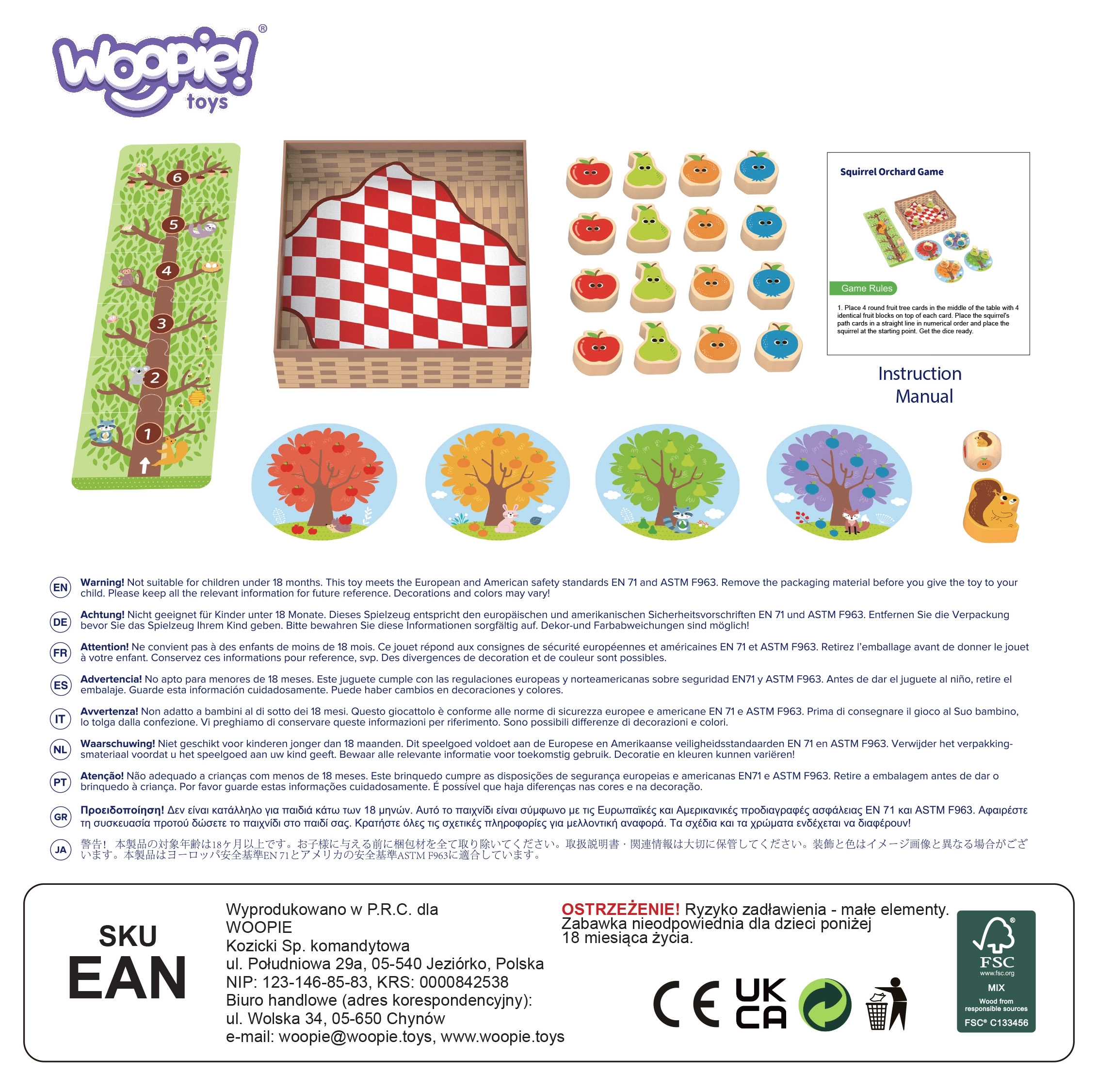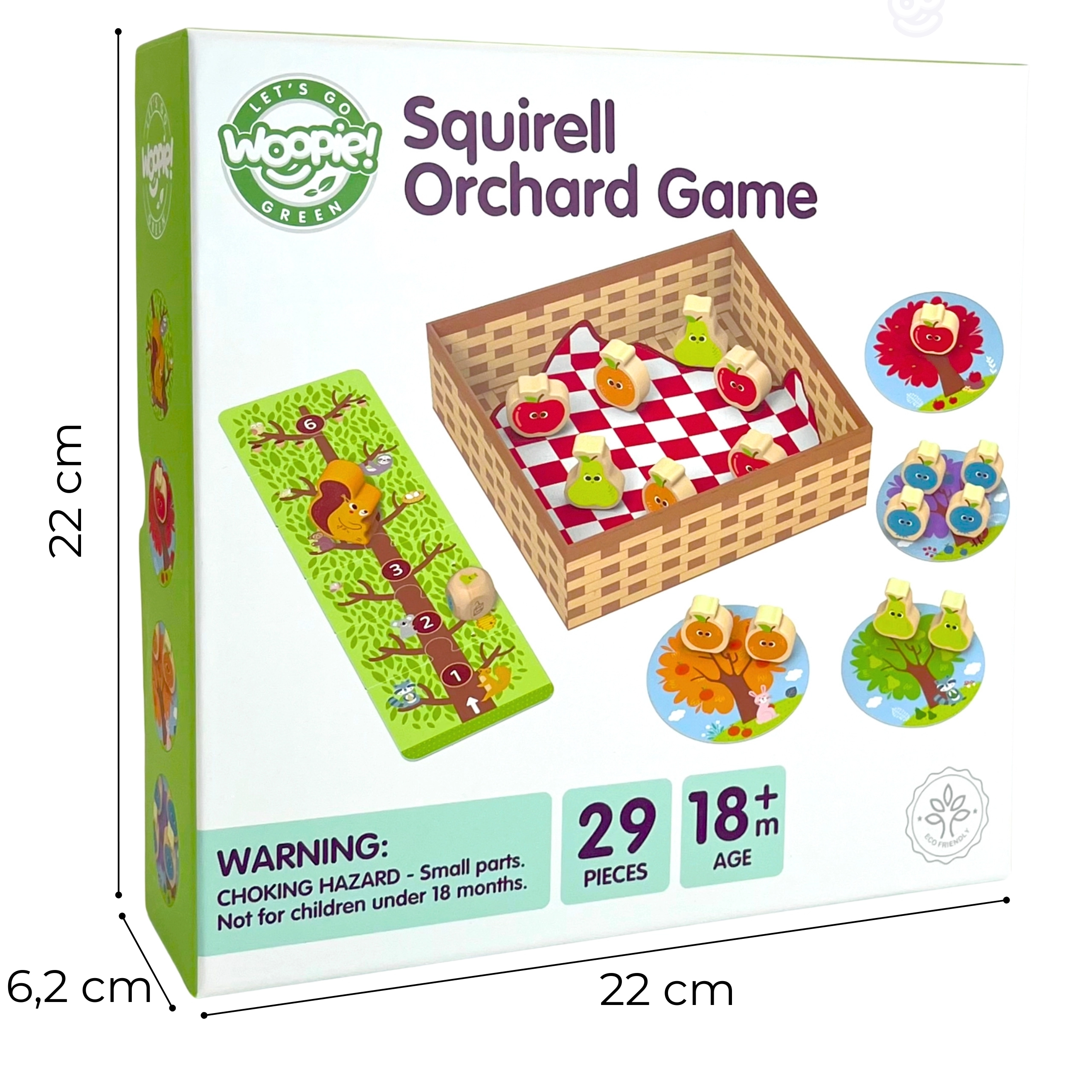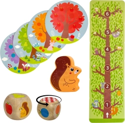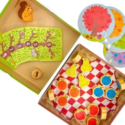 El juego familiar ARDILLA EN EL HUERTO de WOOPIE GREEN es el primer juego de mesa ideal para los más pequeños. Los niños lanzan juntos el dado, recogen frutas de madera de colores del árbol y las ponen en la cesta. Si sale la ardilla, uno de los frutos recogidos vuelve atrás: la tensión y la alegría de la victoria están garantizadas.