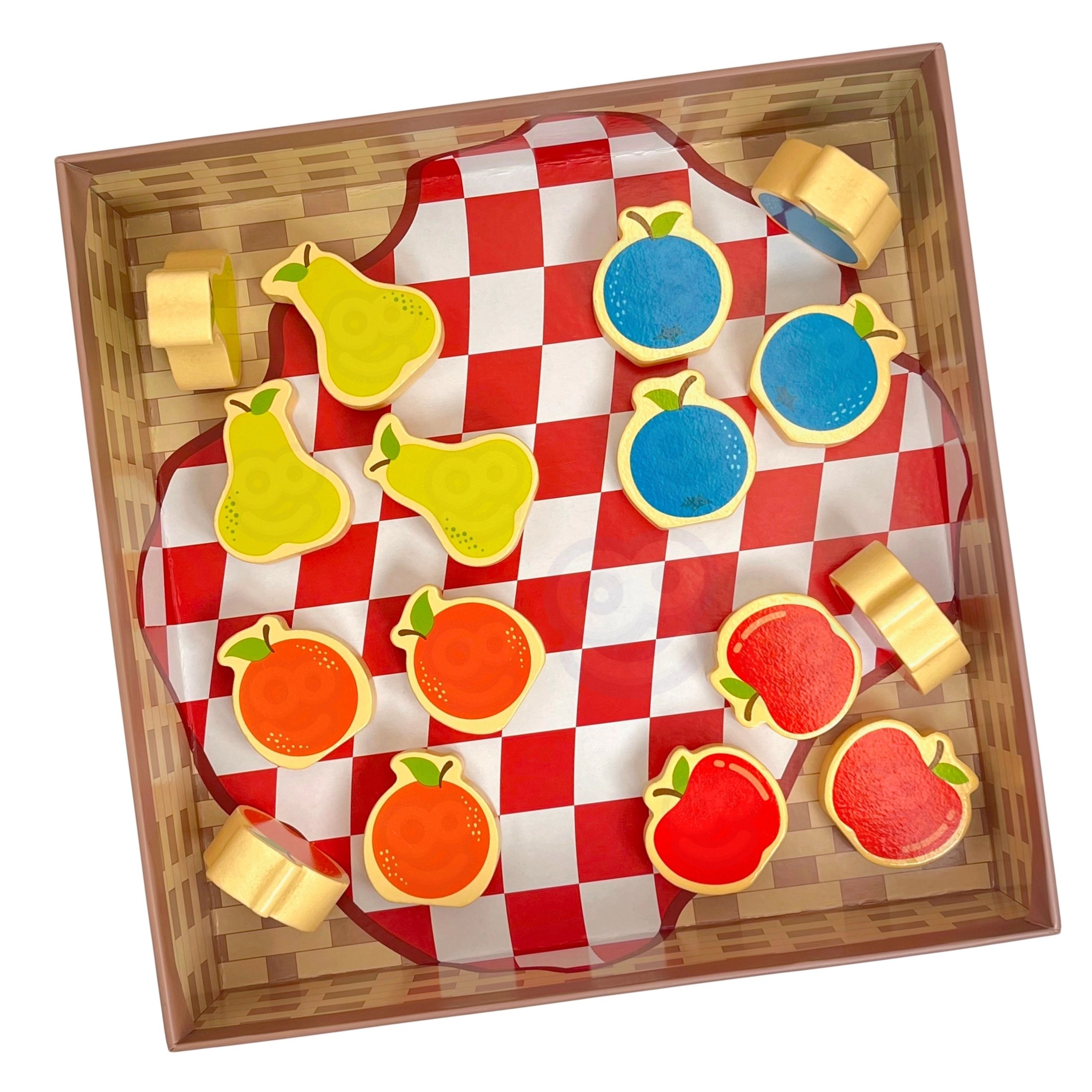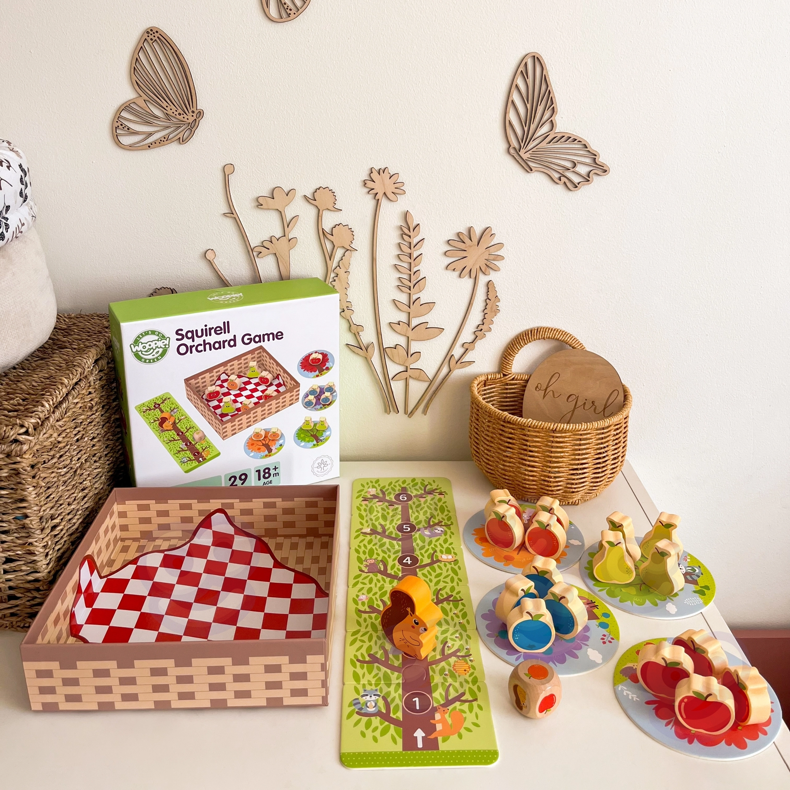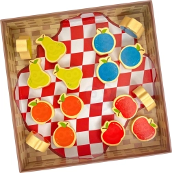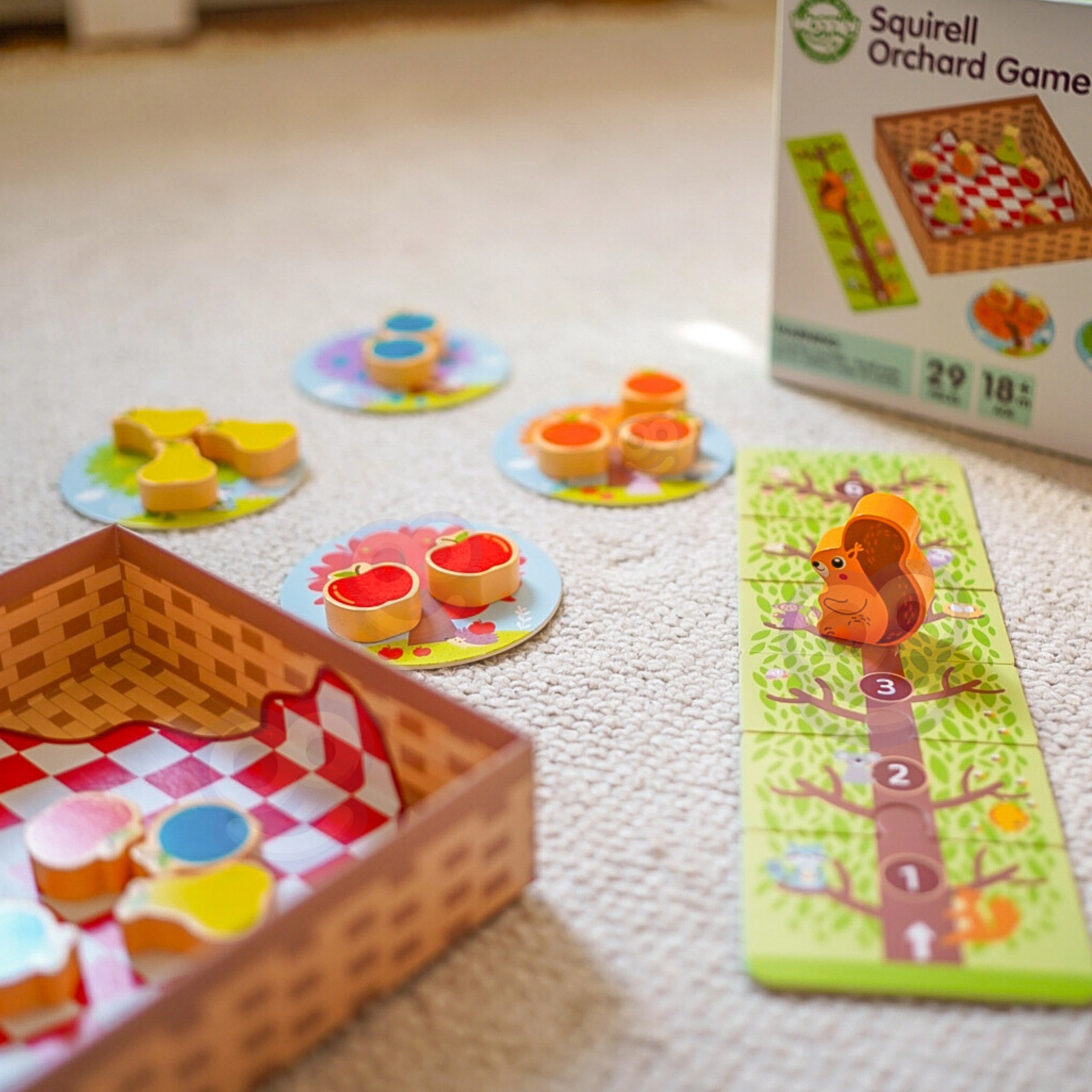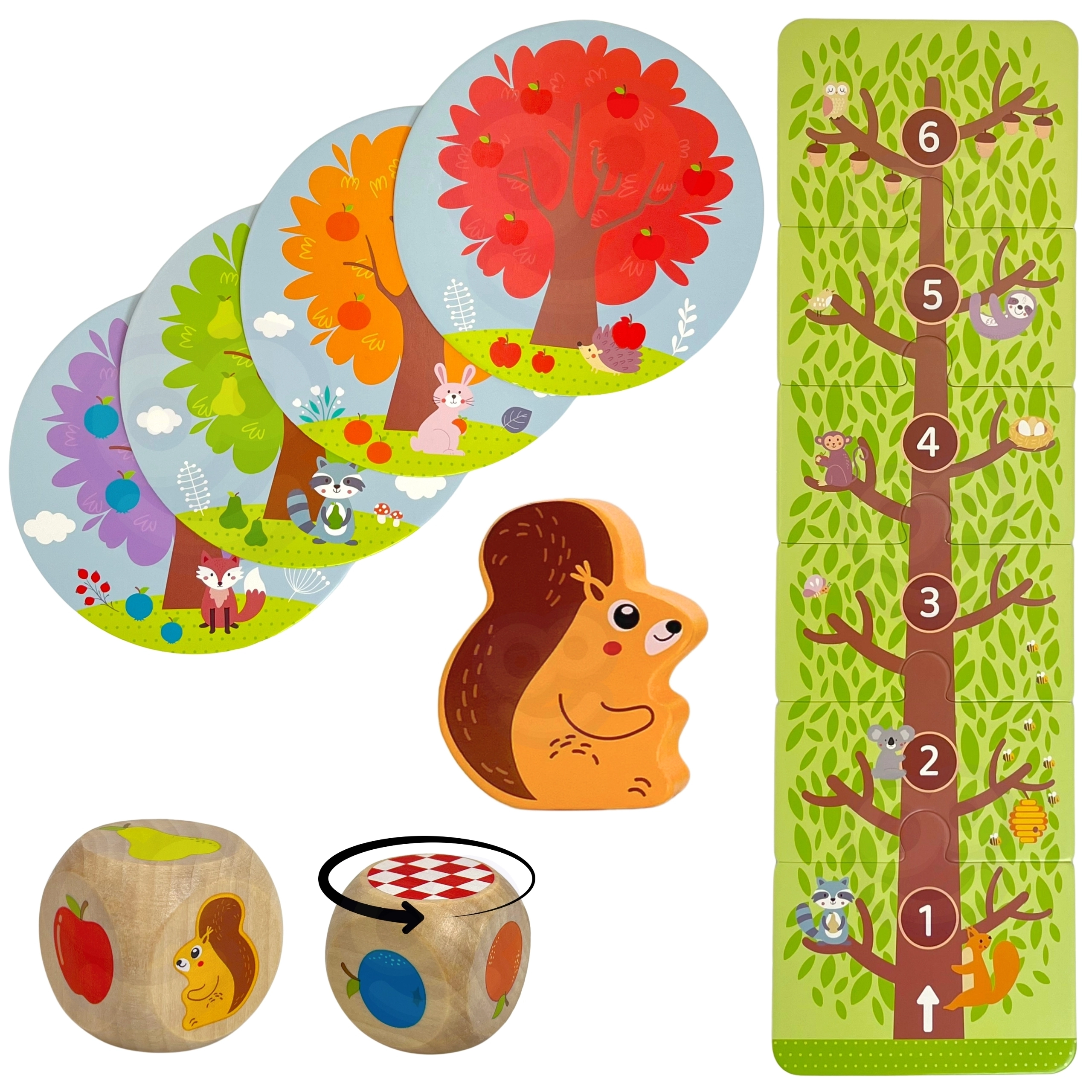 - Lanza el dado: si sale fruta, coloca la pieza correspondiente en la cesta; si sale la ardilla, un fruto vuelve al árbol.