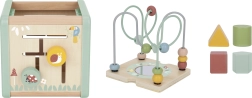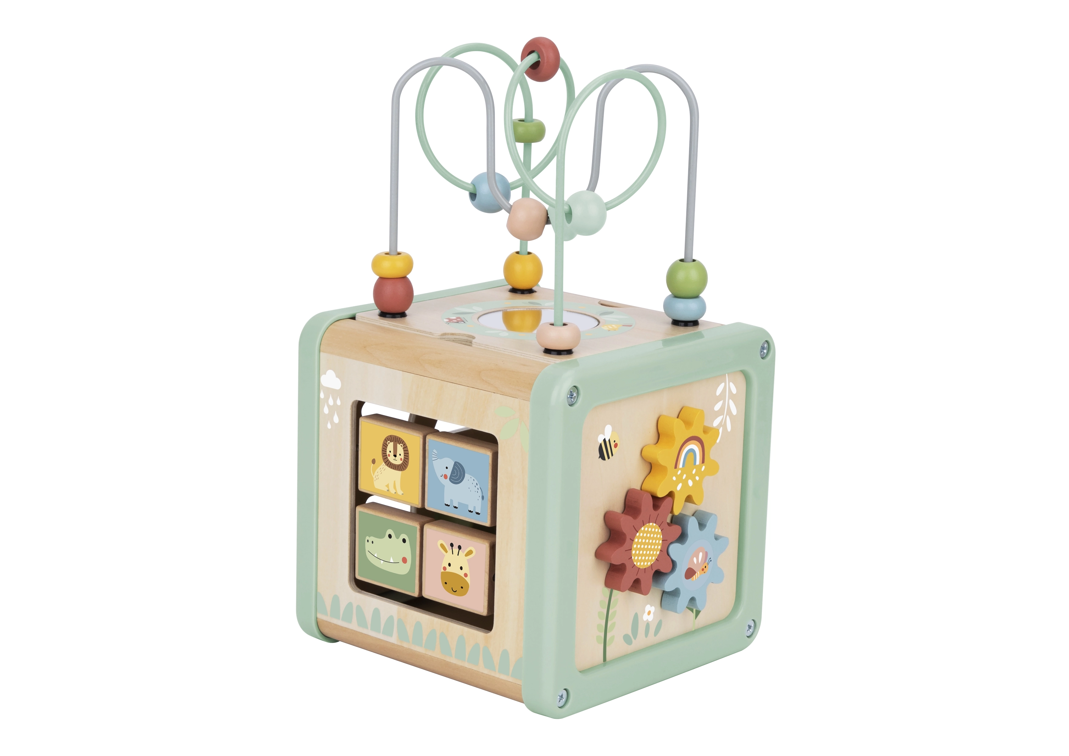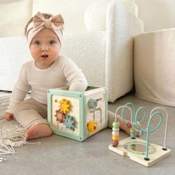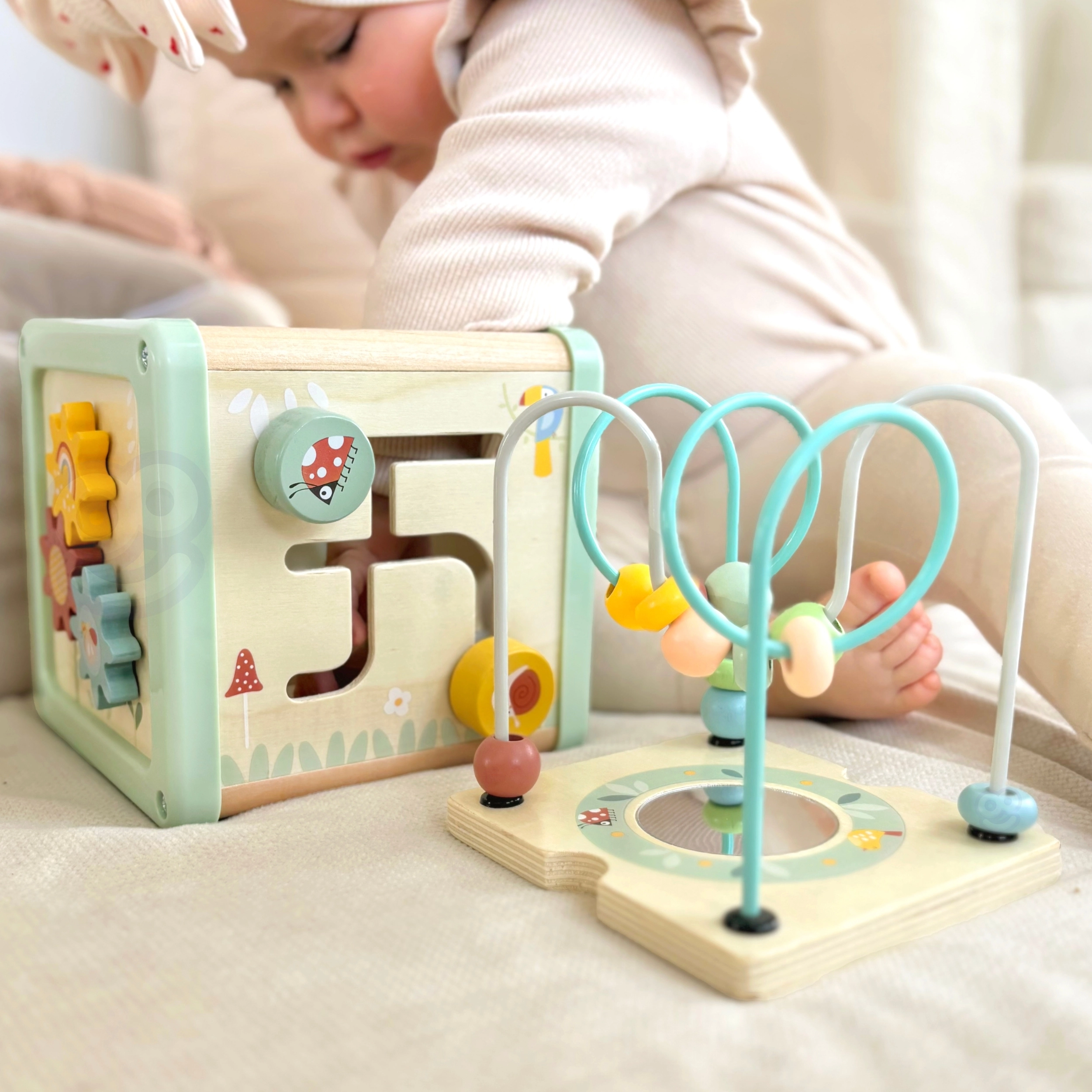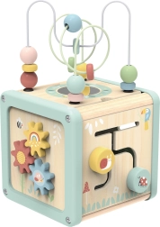 La parte superior del cubo ofrece cuentas de colores para deslizar por alambres curvados que desarrollan la coordinación y la motricidad fina. El espejito estimula la curiosidad y la percepción de uno mismo.