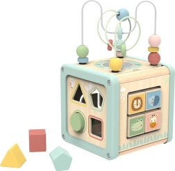 Este cubo de madera multifunción favorece el desarrollo natural del niño mediante un juego significativo. Los colores pastel atraen la atención, mientras que las variadas actividades entrenan la motricidad fina, la coordinación mano-ojo, el pensamiento lógico y el reconocimiento de formas y colores.