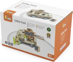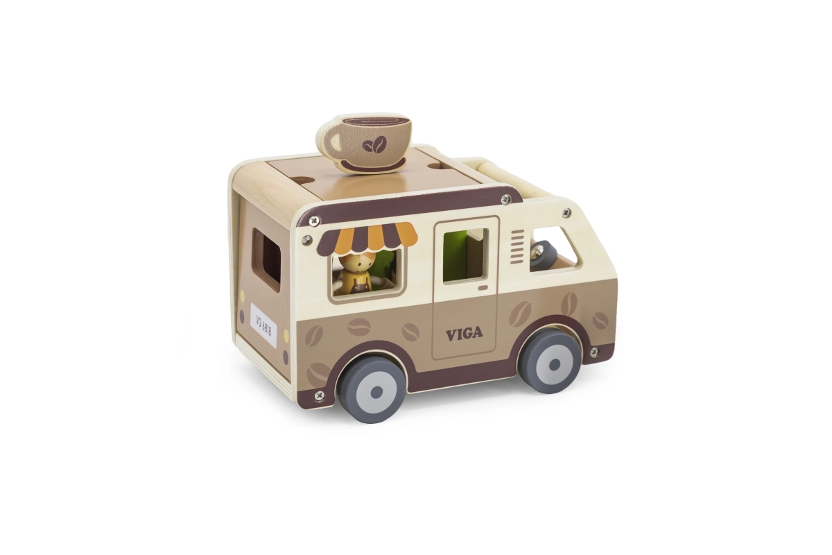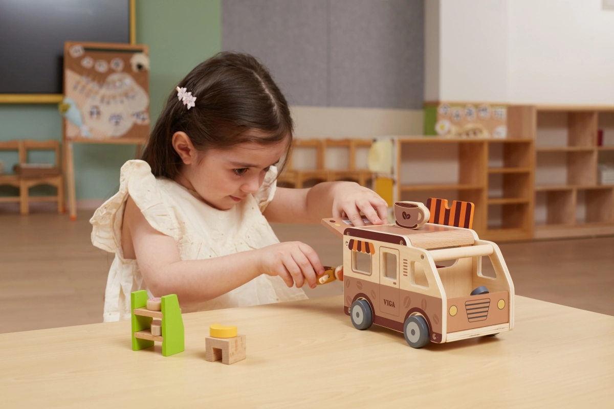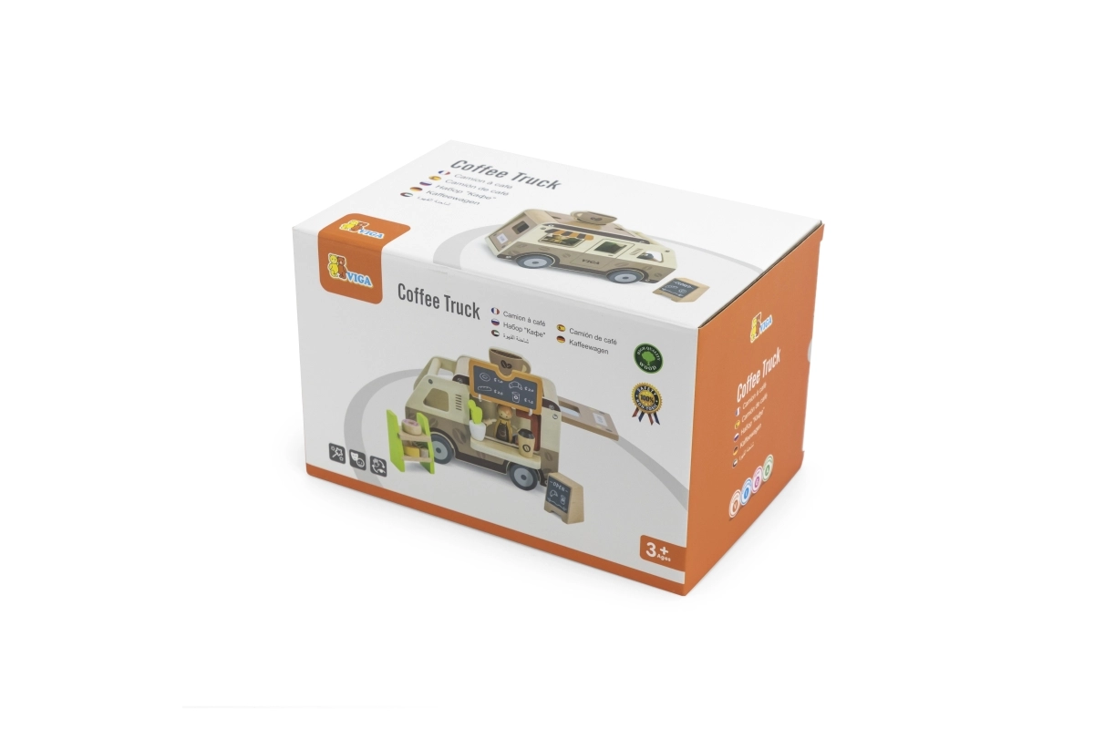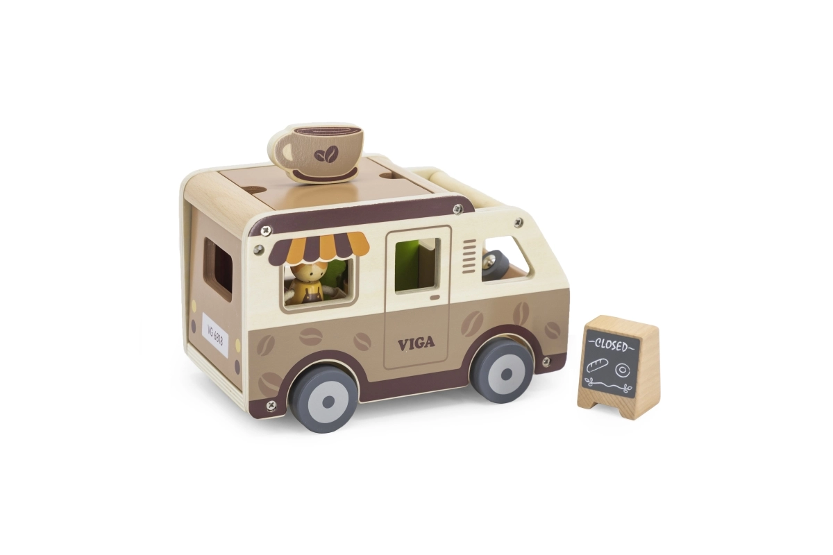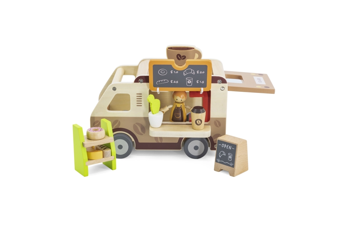 El camión cafetería de madera para niños de VIGA es un juguete bien pensado para los pequeños amantes del juego de roles. Incluye la figura del barista, estantería con delicias, dulces y equipamiento desde café hasta pizarra de menú. Gracias al techo abatible, la ventanilla de atención y el maletero abatible, el juego fluye con naturalidad y recrea la atención real de los clientes.