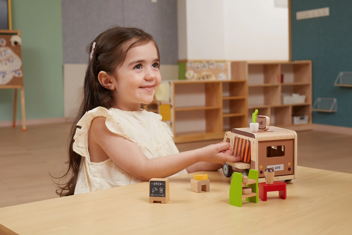 La zona de juego abierta permite a los niños servir “café” y delicias con facilidad y manipular cómodamente los accesorios dentro del camión.