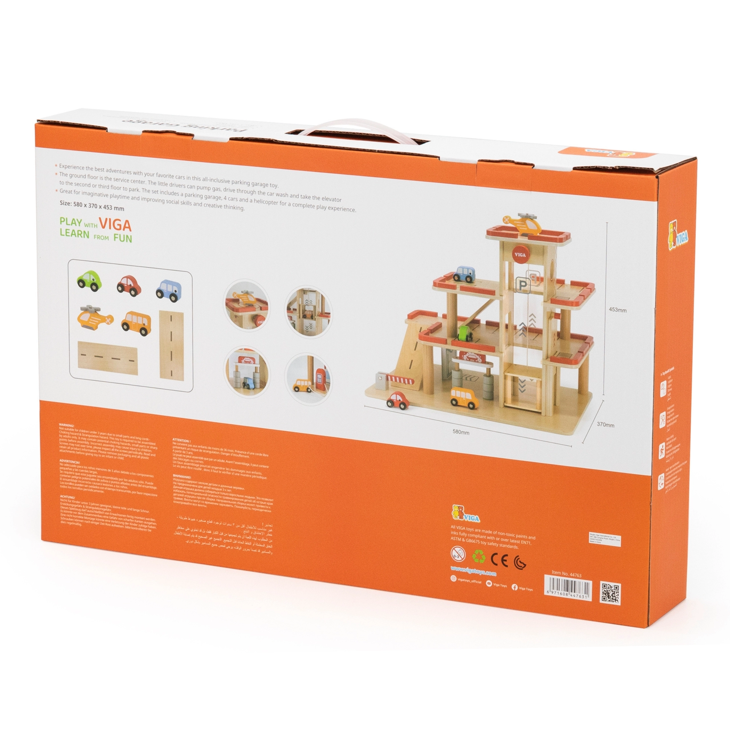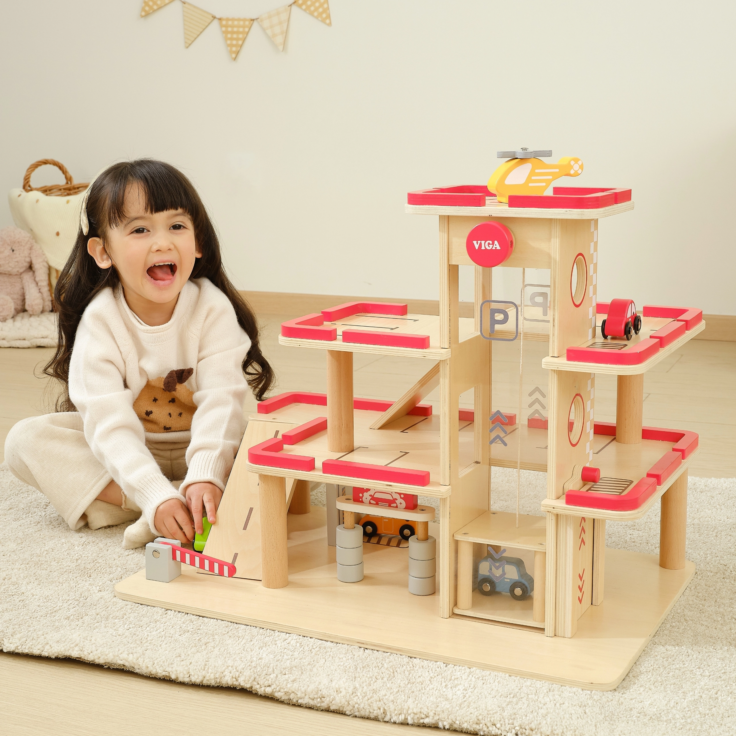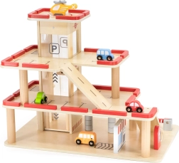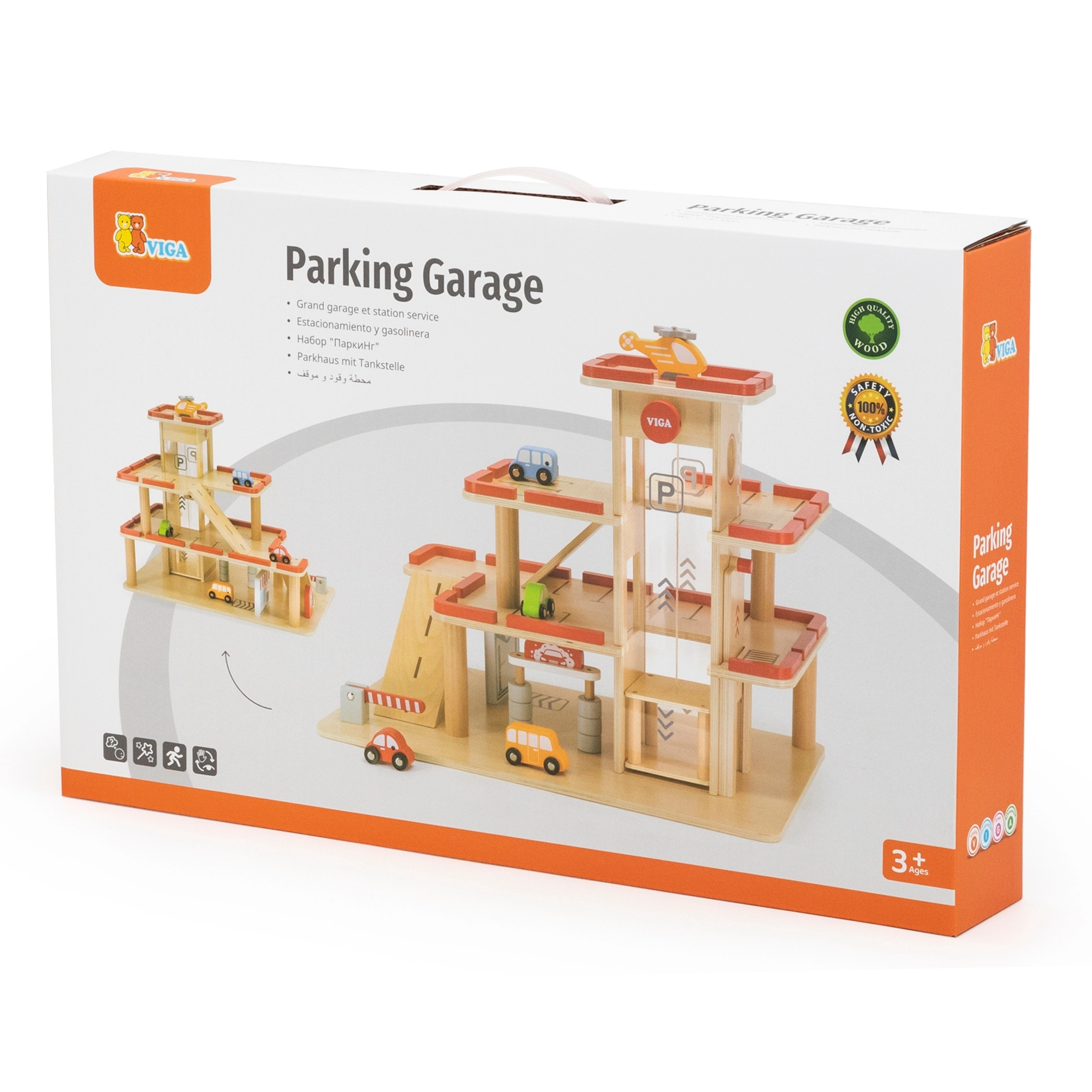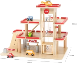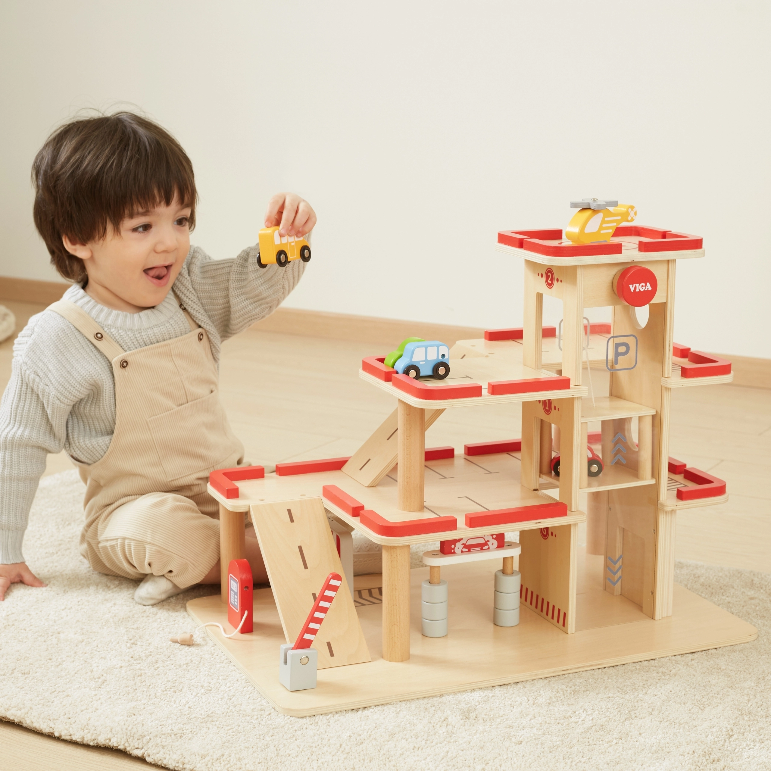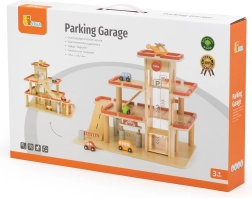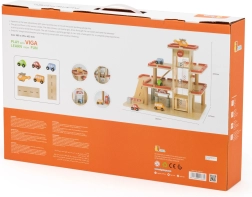 Descubre el garaje de estacionamiento de madera VIGA para niños a partir de 3 años: resistente set de tres niveles con ascensor manual, lavadero y helipuerto. Incluye 4 cochecitos y un helicóptero, detalles realistas y fabricación de madera duradera para juego creativo y desarrollo de la motricidad fina.