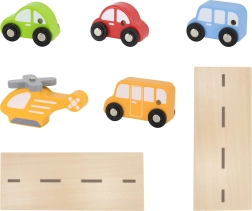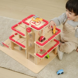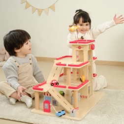El paquete incluye 4 cochecitos de madera, un helicóptero y elementos de entrada y salida. La señalización clara de las plazas, el lavadero y las barreras fomentan escenarios realistas y enseñan a los niños habilidades de coordinación.