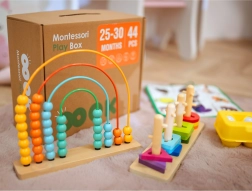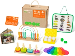 La caja educativa incluye varias actividades, como clasificación de formas, rompecabezas de animales y placas ópticas de colores, que desarrollan la imaginación visual y la destreza manual. Otras actividades incluyen un ábaco arcoíris, que enseña matemáticas básicas, y una pista de bolas Montessori, que perfecciona la coordinación ojo-mano. También hay libros que ayudan a los niños a comprender las relaciones entre lo grande y lo pequeño, así como muchos otros ejercicios creativos.