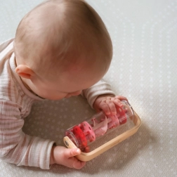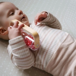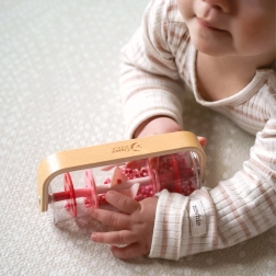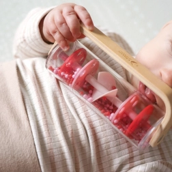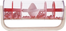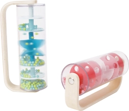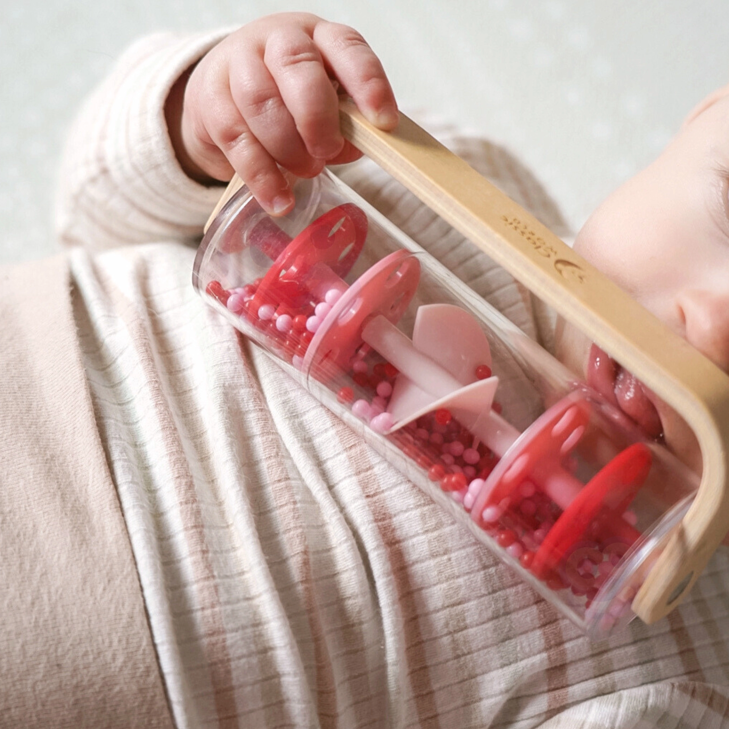 Este palo de lluvia rojo combina madera natural y un cuerpo transparente lleno de bolitas que, al moverlo, se deslizan suavemente creando un sonido relajante y rítmico. Los niños pueden agitarlo, girarlo 360° y observar cómo las cuentas descienden desde la parte superior: un excelente estímulo para la vista, el oído y la motricidad fina.