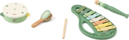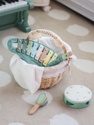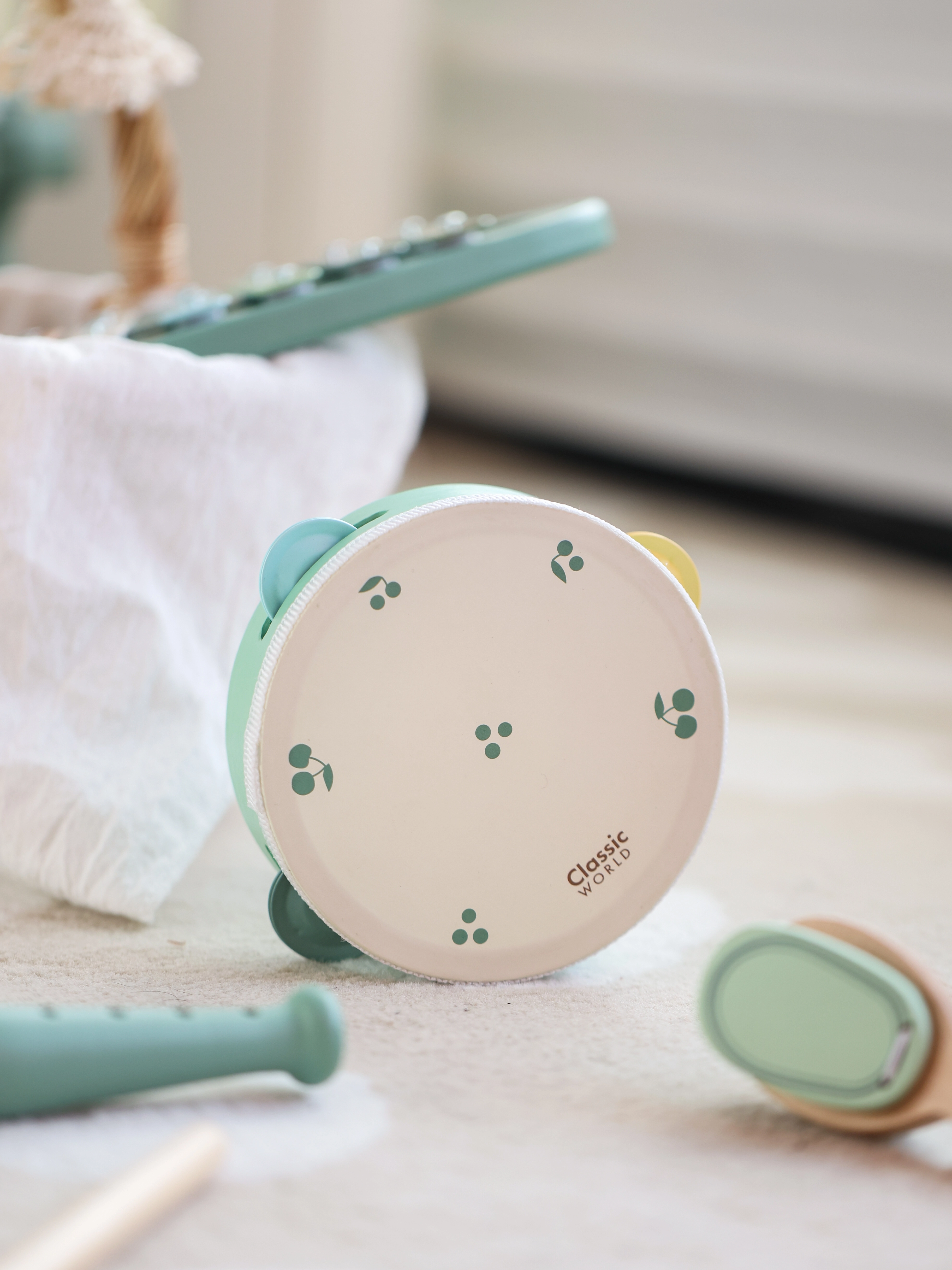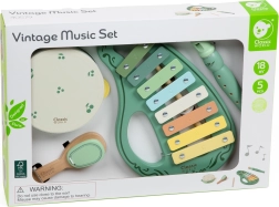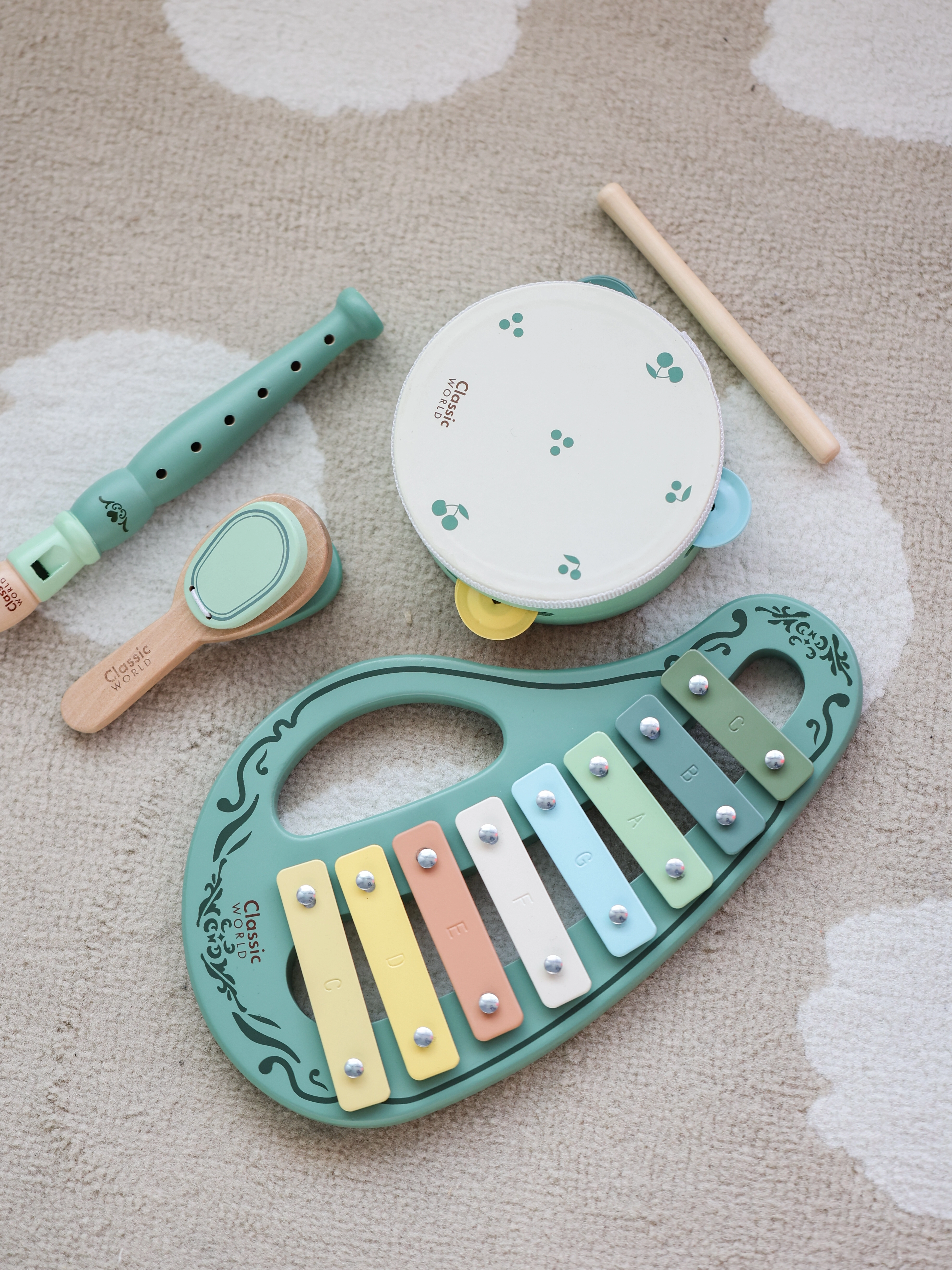 Este elegante set de estilo vintage contiene todo lo que los más pequeños necesitan para descubrir el mundo de los sonidos: cimbalitos (xilófono), pandereta, flauta dulce/recorder, castañuela y baqueta. Gracias a la combinación de madera y metal, los instrumentos ofrecen un sonido agradable y resisten el uso diario.