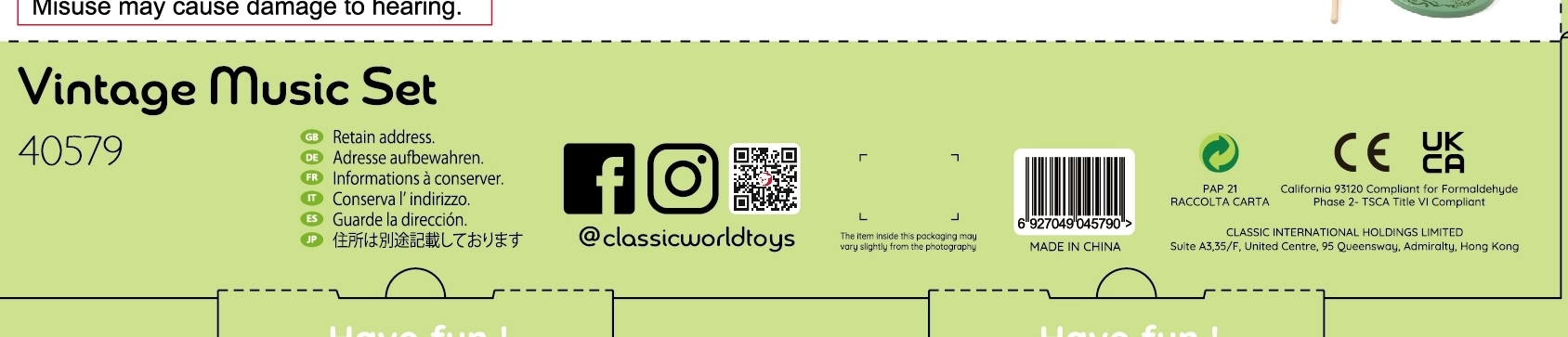 Descubre la alegría de la música con este conjunto vintage de instrumentos musicales de madera de CLASSIC WORLD. Sus colores pastel, la alta calidad de fabricación y los bordes redondeados y seguros lo convierten en la opción ideal para los primeros pasos musicales. Fomenta la creatividad, el ritmo y la escucha, y es perfecto como regalo para niños a partir de 18 meses.