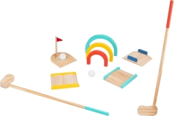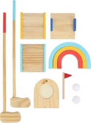 El paquete incluye 2 putters, 2 pelotas, un hoyo con banderita fácil de montar y obstáculos y túneles coloridos que permiten crear diferentes recorridos. Las pinturas seguras y no tóxicas y los bordes suaves garantizan un juego sin preocupaciones incluso para los más pequeños.