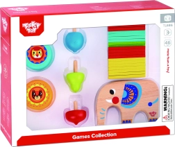 Este colorido set de madera de 46 piezas combina varios juegos populares en un solo paquete. Los niños pueden equilibrar varillas en el lomo del elefante, construir una torre o un pozo, jugar al mikado, practicar trucos con el par de yo-yos y competir para ver cuál peonza gira más tiempo. Ideal para el juego individual y para competiciones en familia.