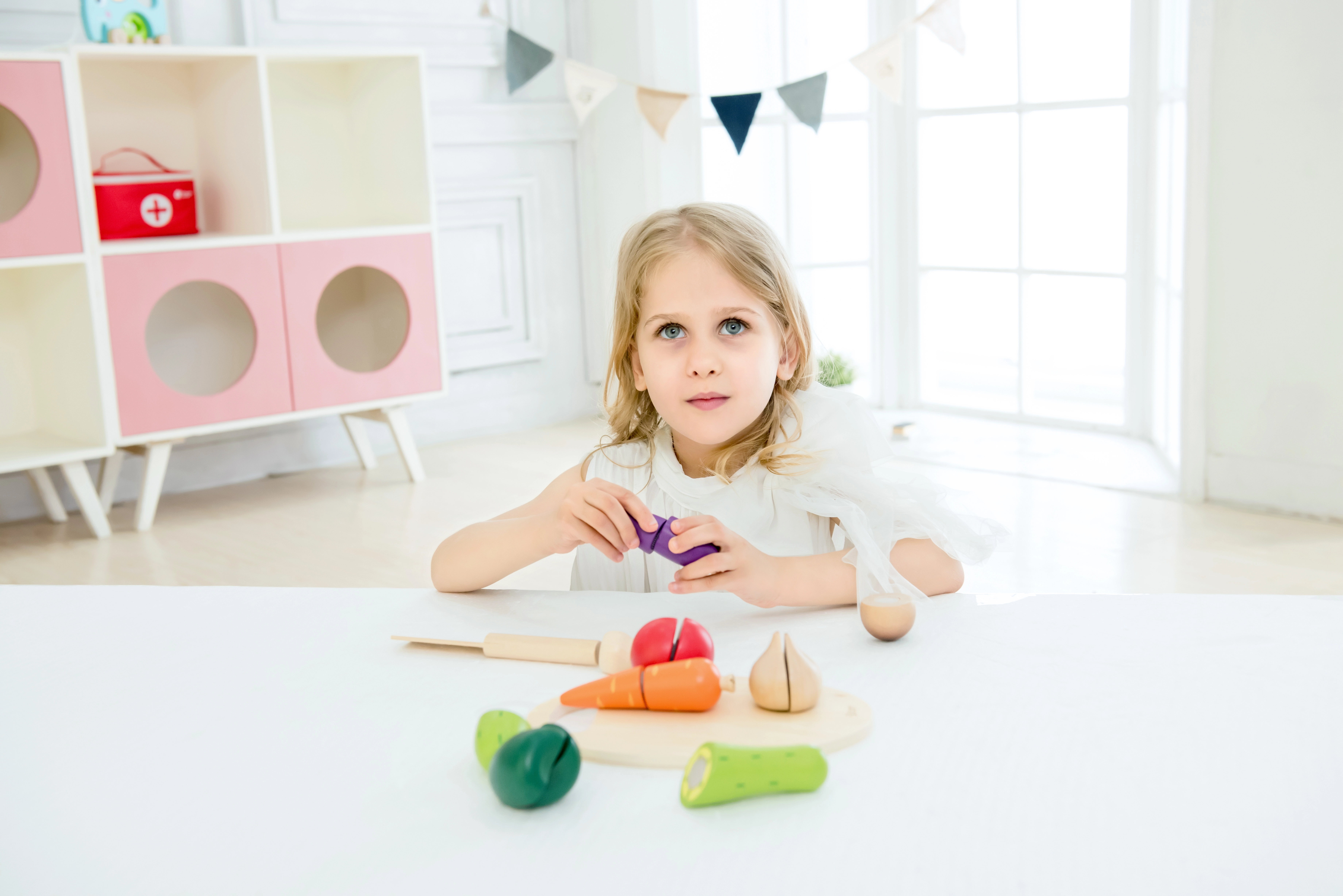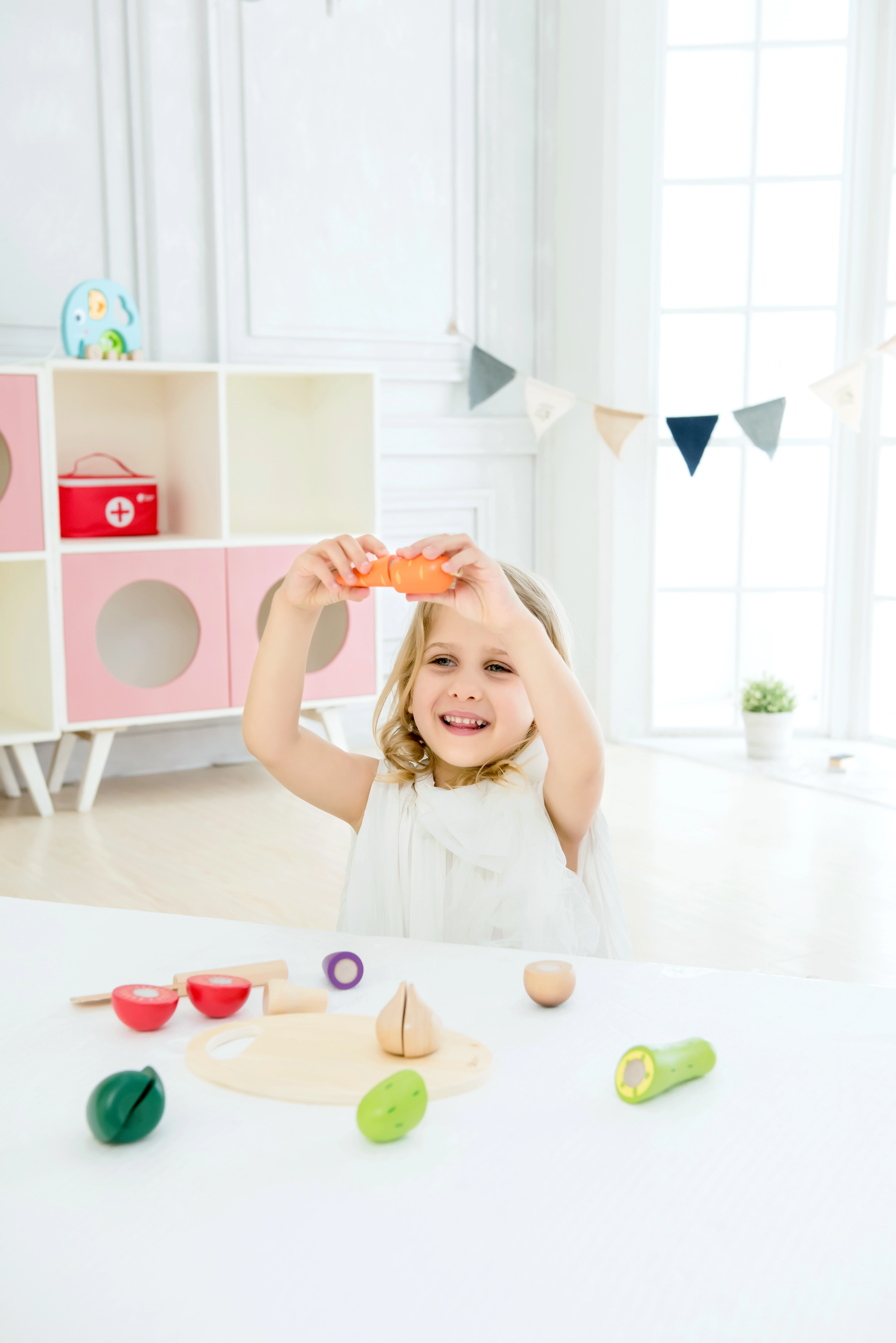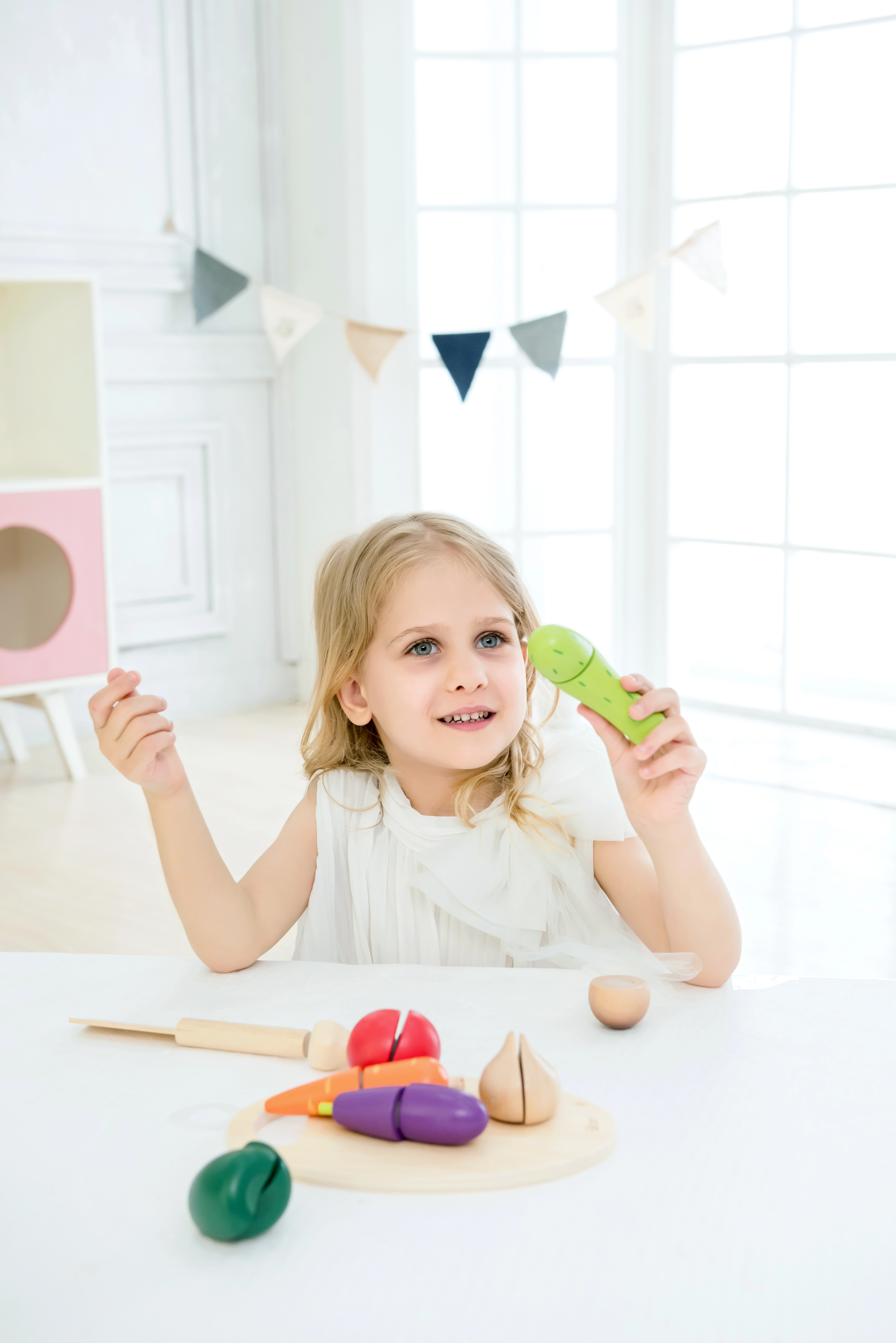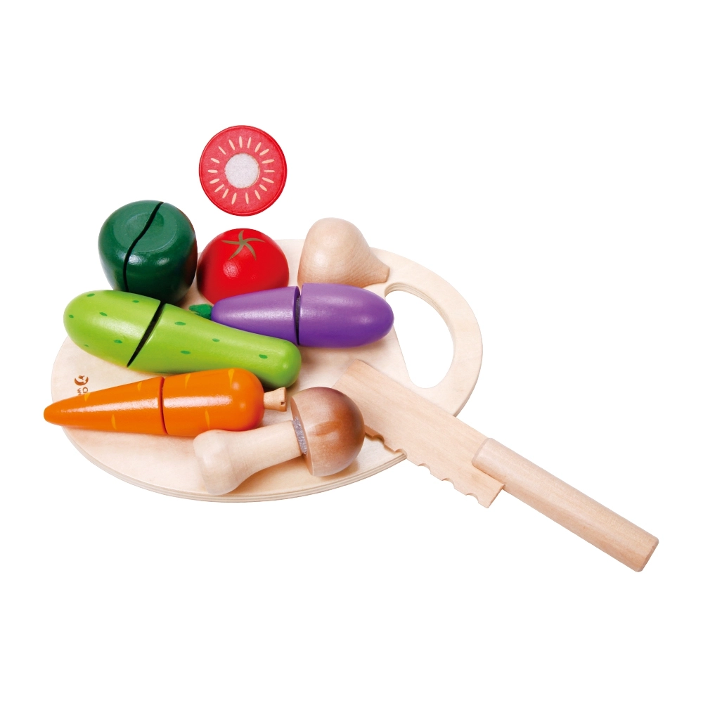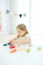 El juego con alimentos favorece el desarrollo de la motricidad fina, la coordinación mano-ojo, la creatividad y el reconocimiento de colores y formas. Los materiales naturales y el cuidadoso acabado garantizan durabilidad y seguridad en el juego diario.
