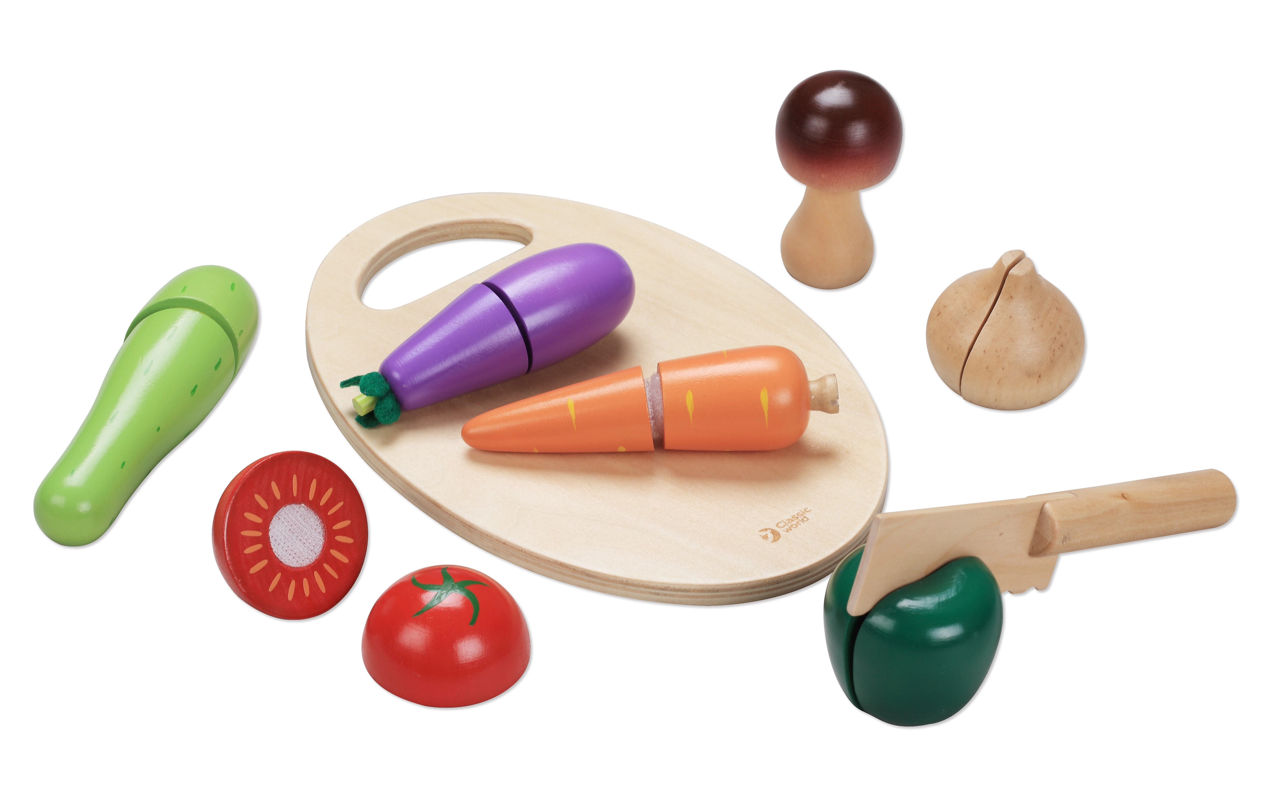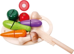 Este set de cortar verduras de madera de la marca CLASSIC WORLD es ideal para pequeños chefs a los que les gusta imitar el mundo de los adultos. Las piezas de verdura están unidas con velcro, por lo que los niños pueden “cortarlas” con el cuchillo de madera y volver a unirlas: divertido, seguro y educativo.