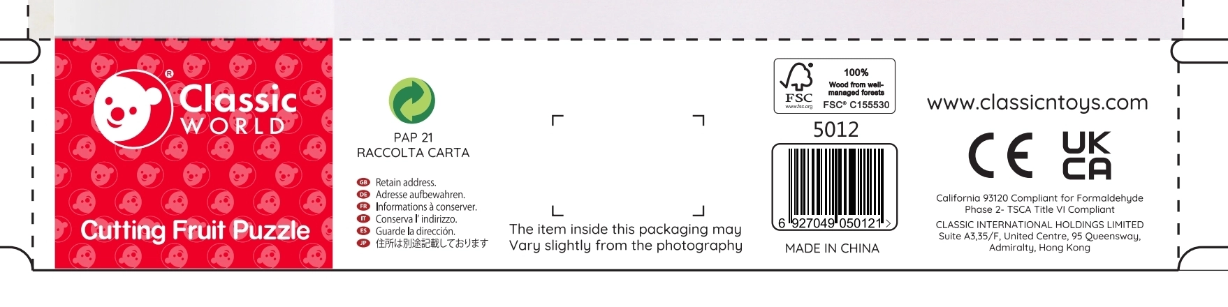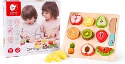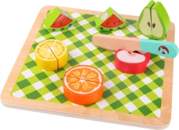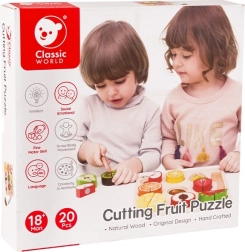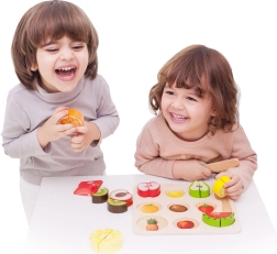 El set incluye 20 piezas, entre ellas una tabla de doble cara, un cuchillito y diversas frutas. Este juguete seguro para niños a partir de 18 meses está hecho de madera barnizada y pintado con pinturas no tóxicas, lo que asegura que sea completamente seguro de usar.