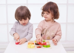 Los niños mejoran sus habilidades motoras al montar y cortar la fruta con el cuchillo de madera.