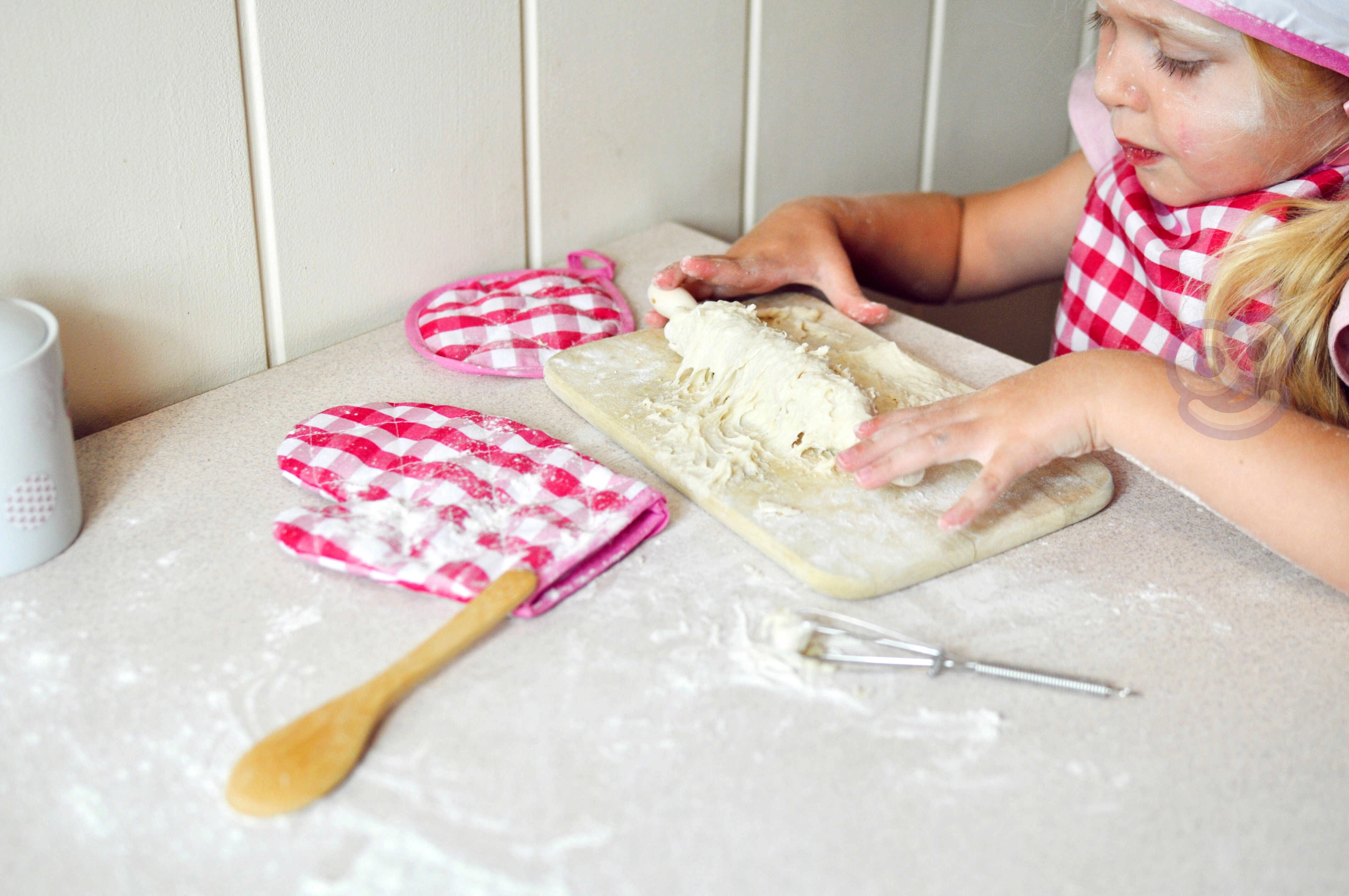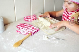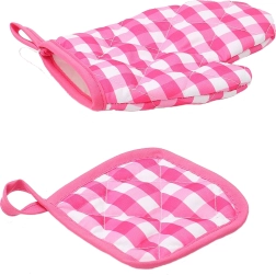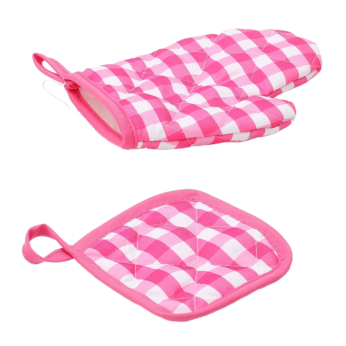 Los guantes y el agarrador de tela con cuadros rosa y blanco protegen las pequeñas manos de las superficies calientes, haciendo que cocinar sea seguro.
