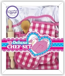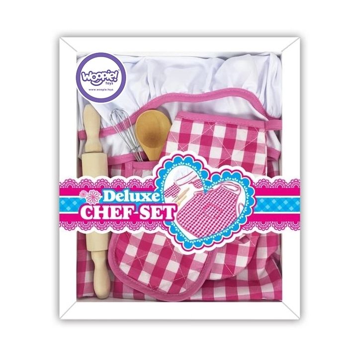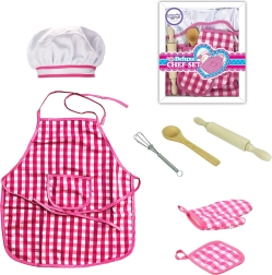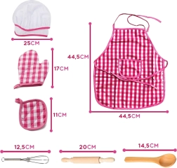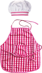 El delantal y el gorro con estampado de cuadros rosa y blanco son los elementos principales que garantizan una experiencia de juego estilosa y funcional para los niños.