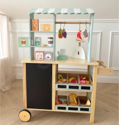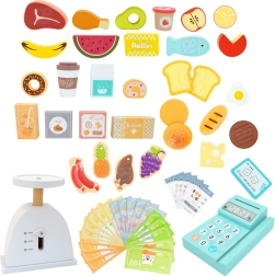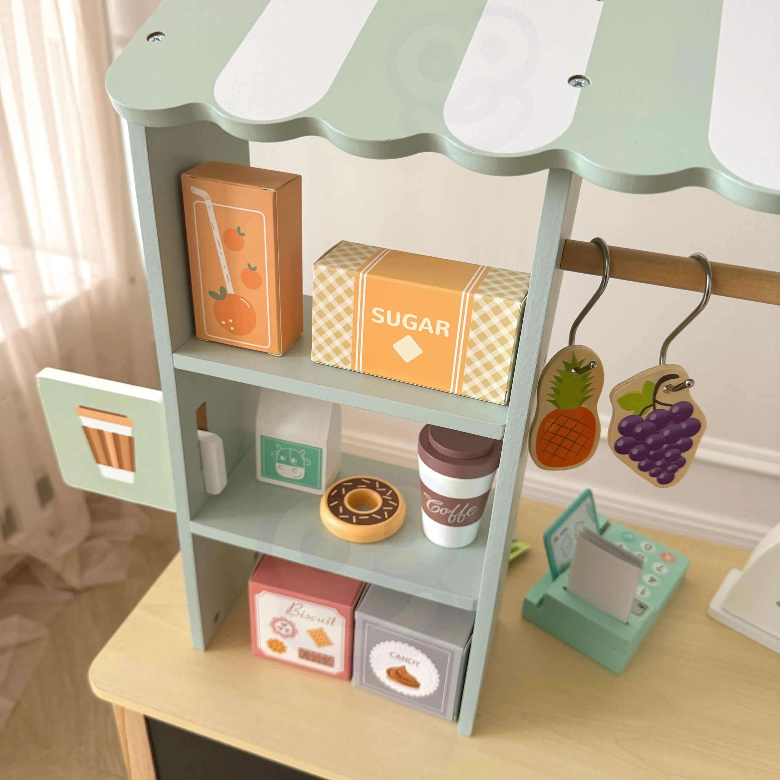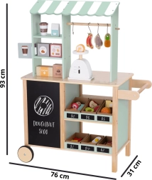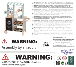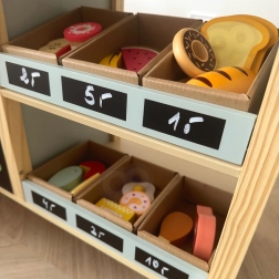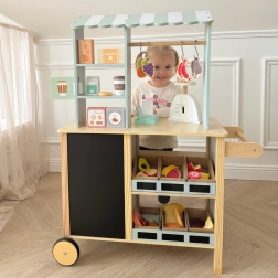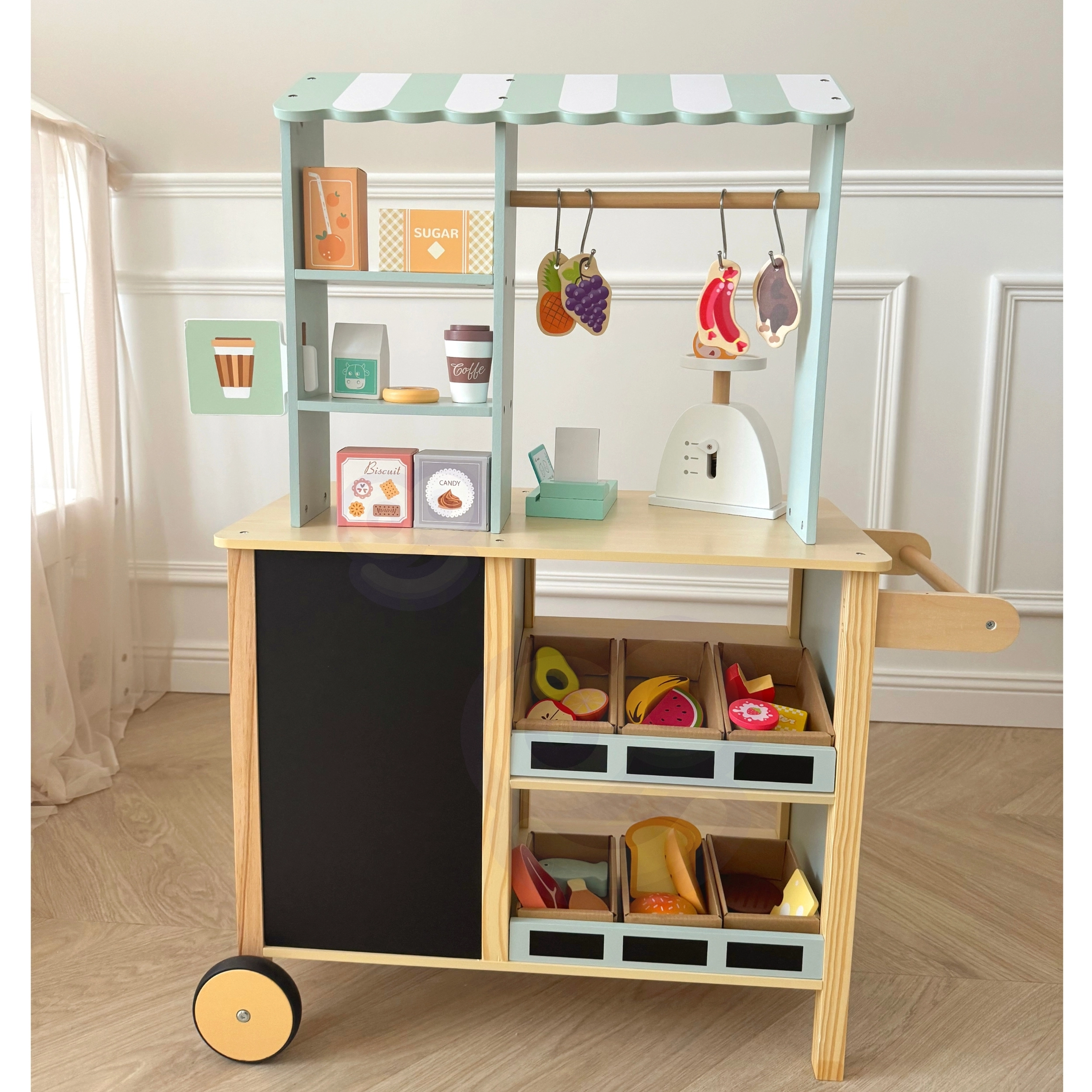 La tienda de madera WOOPIE GREEN es el juguete ideal para niños que aprenden habilidades sociales, matemáticas y de organización mediante el juego de roles. Contiene 73 elementos, incluida una balanza, productos alimenticios, lector de tarjetas y pizarra para tiza para notas. Todo está hecho de madera segura y pintado con pinturas no tóxicas.