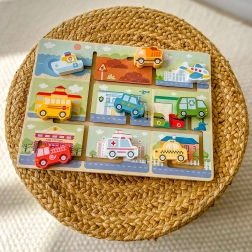 Los niños desplazan la ambulancia, el coche de policía, el autobús o el barco por las pistas y los colocan en escenas temáticas. Practican el pensamiento lógico y amplían el vocabulario sobre los medios de transporte.