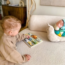 Tablero de madera resistente, bordes lisos y pinturas no tóxicas. Las piezas gruesas se agarran fácilmente y favorecen la motricidad fina y la coordinación mano-ojo.