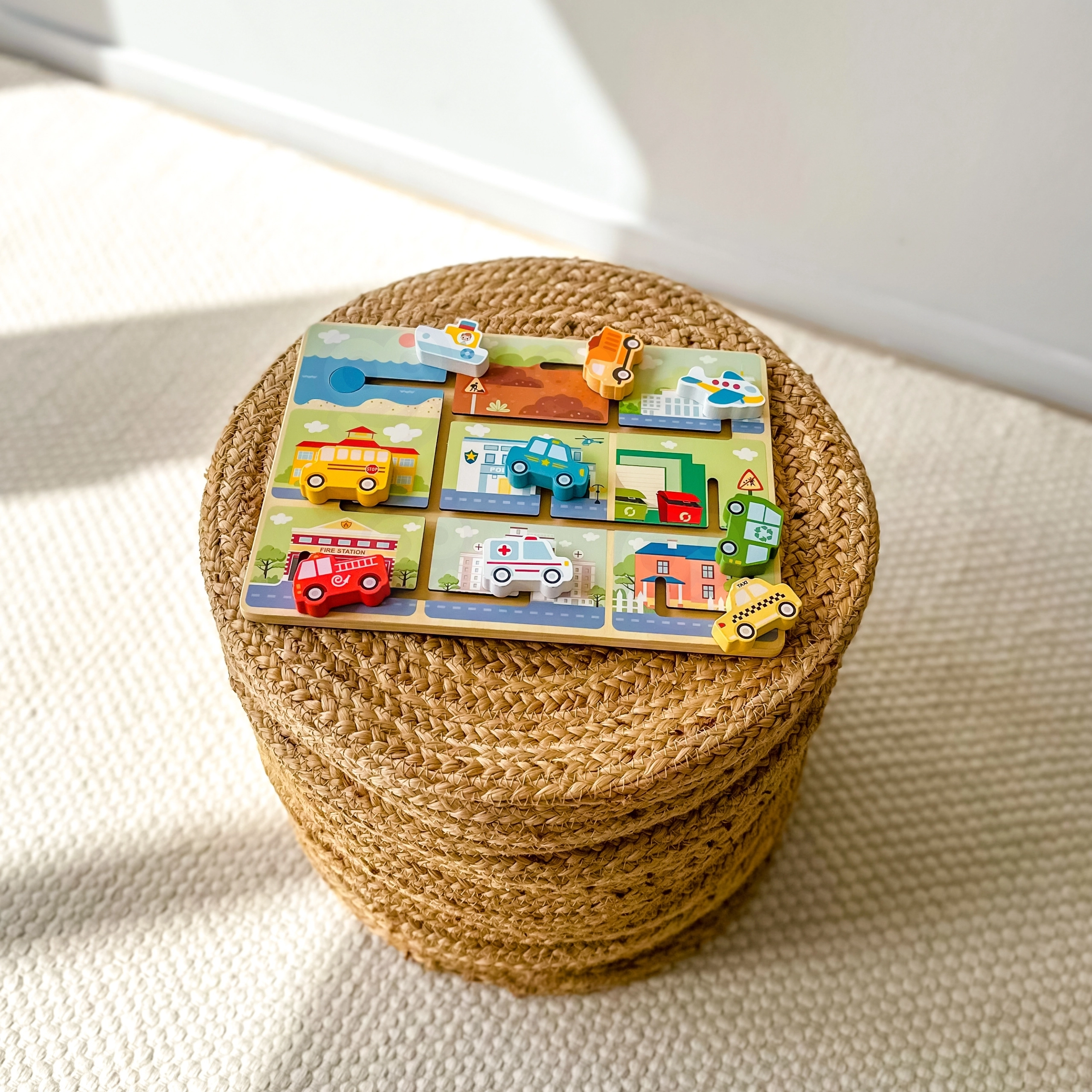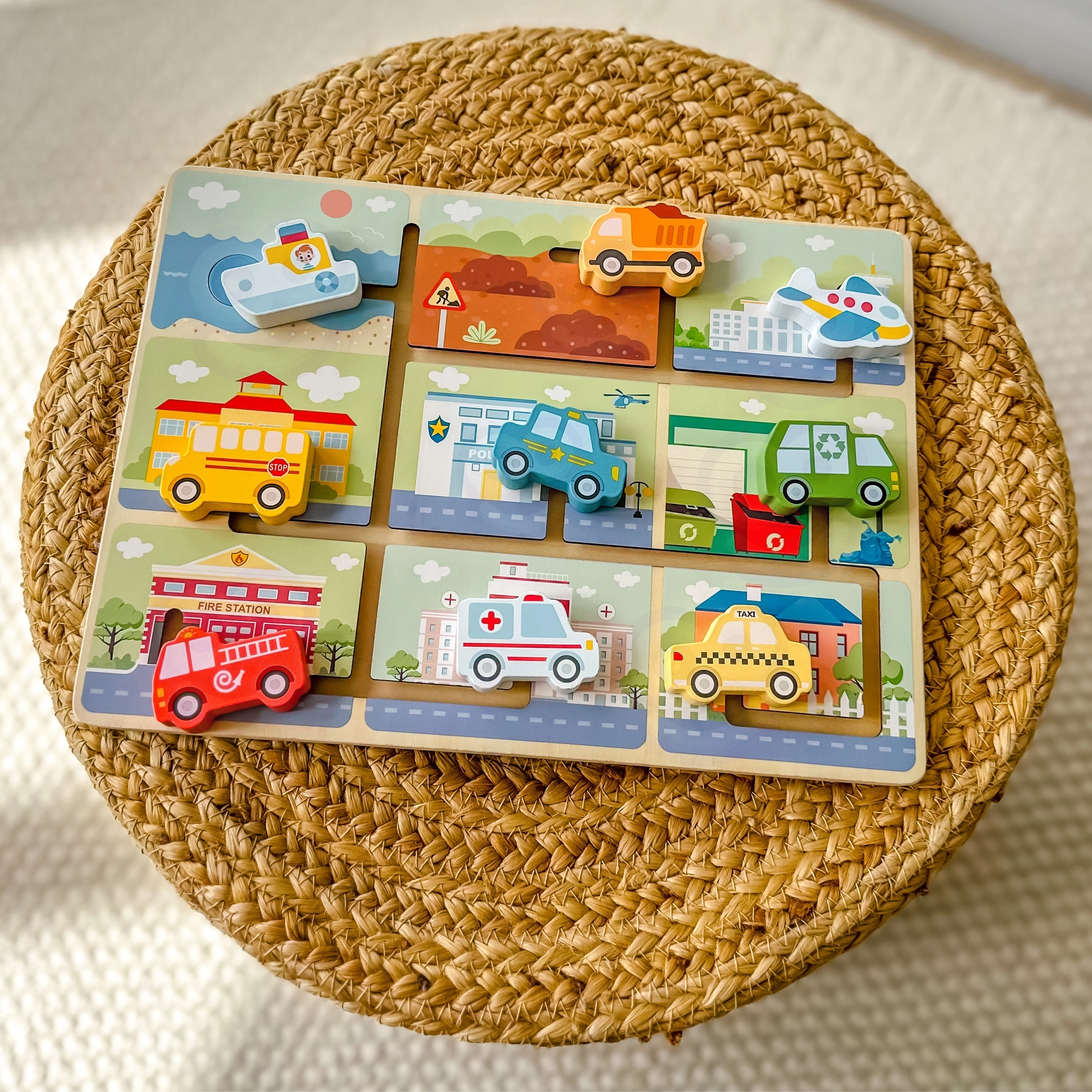 Este laberinto de madera de alta calidad con temática de ciudad y medios de transporte es una elección ideal para niños a partir de 18 meses. El tablero robusto, los bordes suaves y los colores intensos de pinturas seguras y no tóxicas garantizan un juego seguro y duradero. Los niños desplazan las piezas por ranuras fresadas y aprenden dónde pertenece el coche de policía, la ambulancia, el autobús escolar, el camión de bomberos, el barco o el avión.