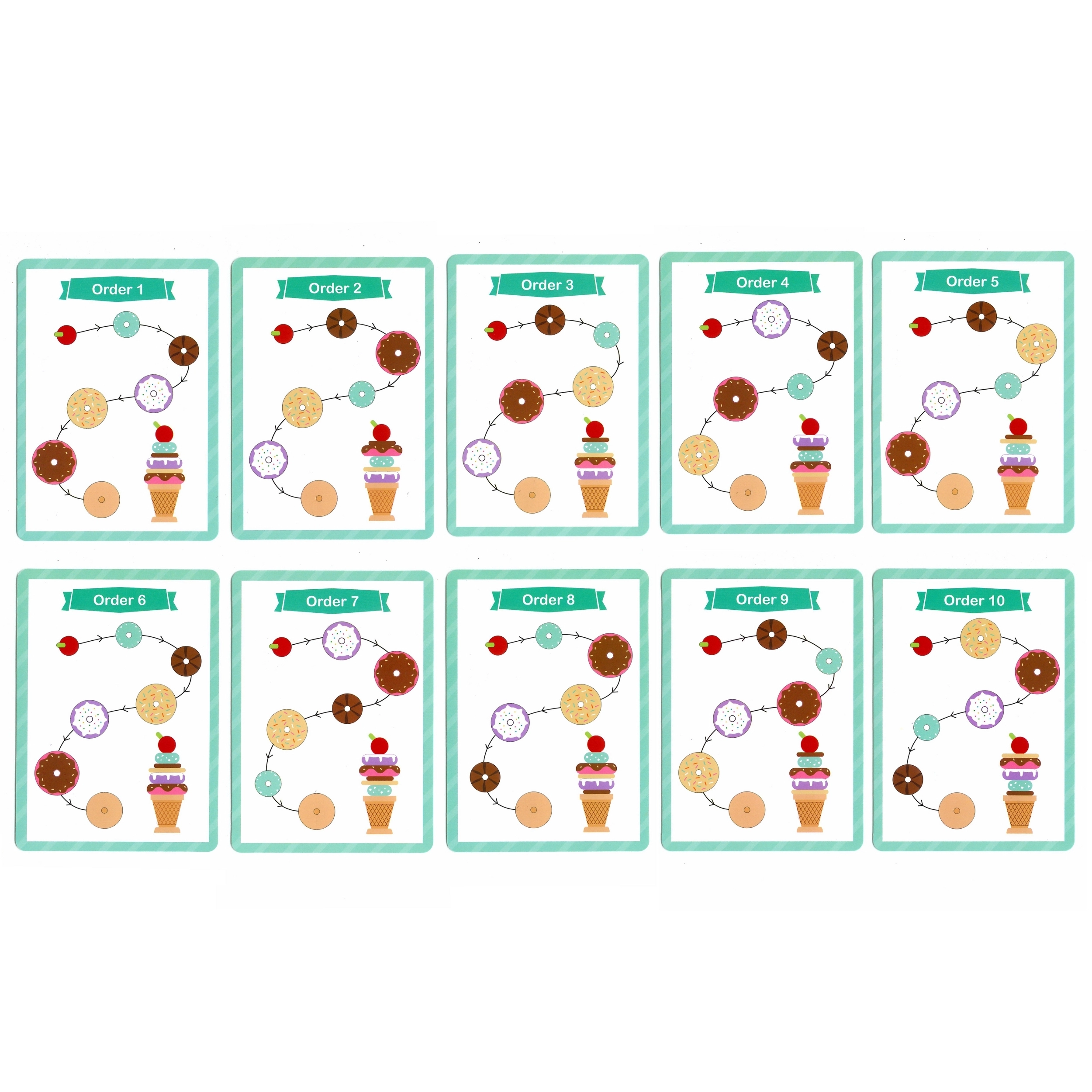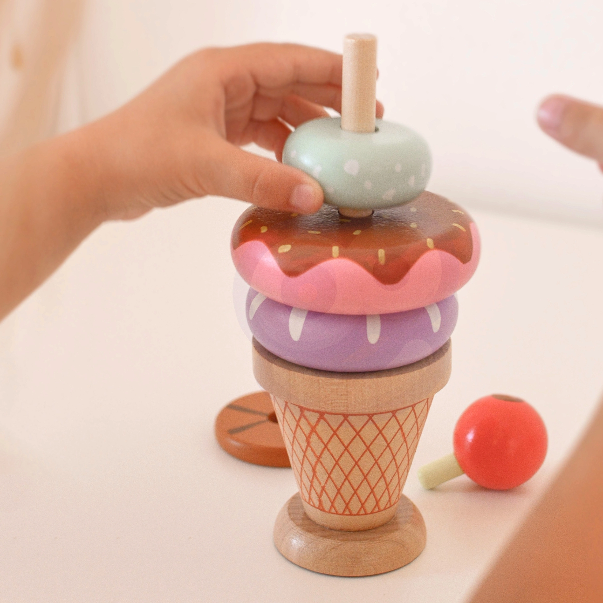 - 12 piezas en el set: distintos anillos de colores y un cono de madera con una cereza en la parte superior
