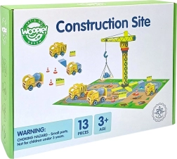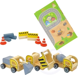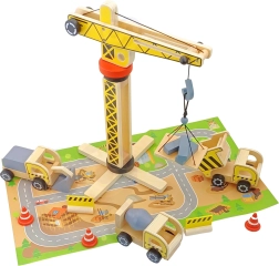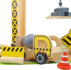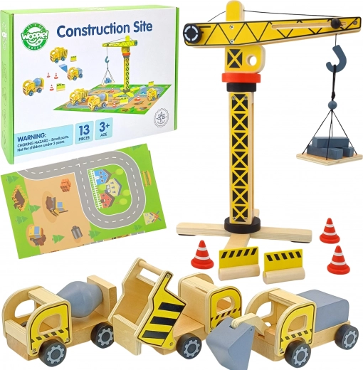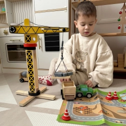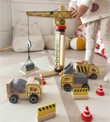 El set de construcción ampliado de la marca WOOPIE GREEN está pensado para pequeños constructores. Este set incluye una gran grúa de madera, tres vehículos de obra y otros accesorios para juegos de construcción realistas.