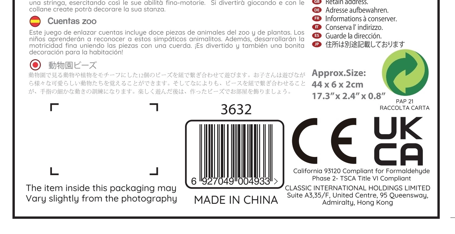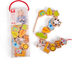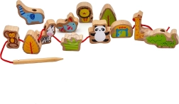 Incluye 12 cuentas de madera y un cordón con aguja de madera. Los bordes suaves y el tamaño adecuado garantizan un uso cómodo y seguro.