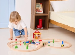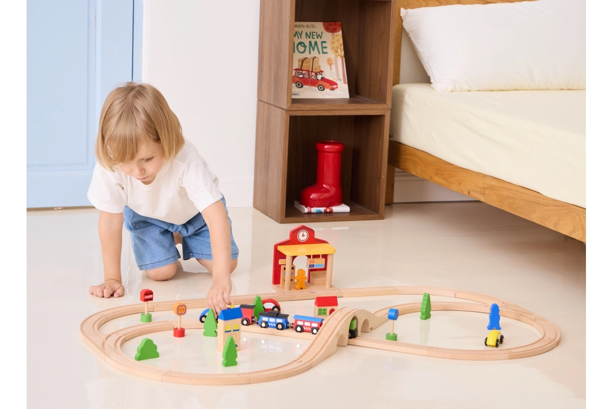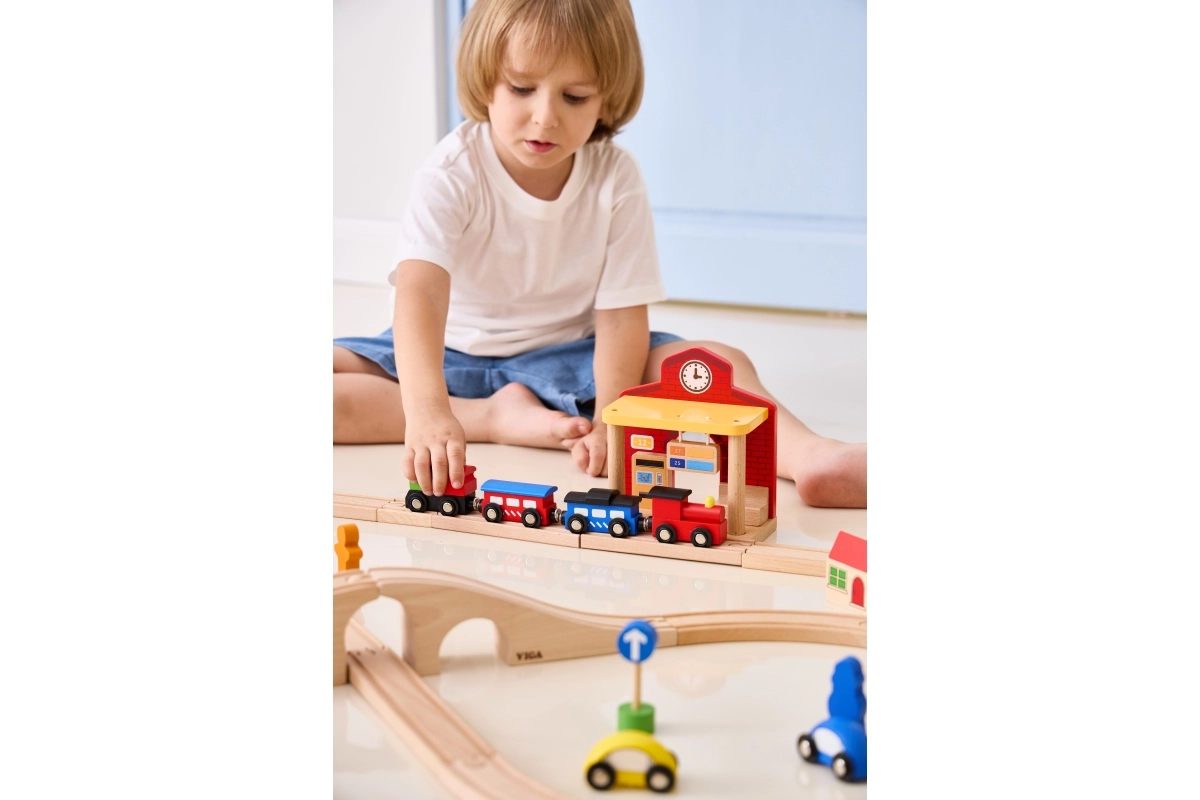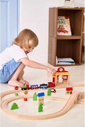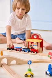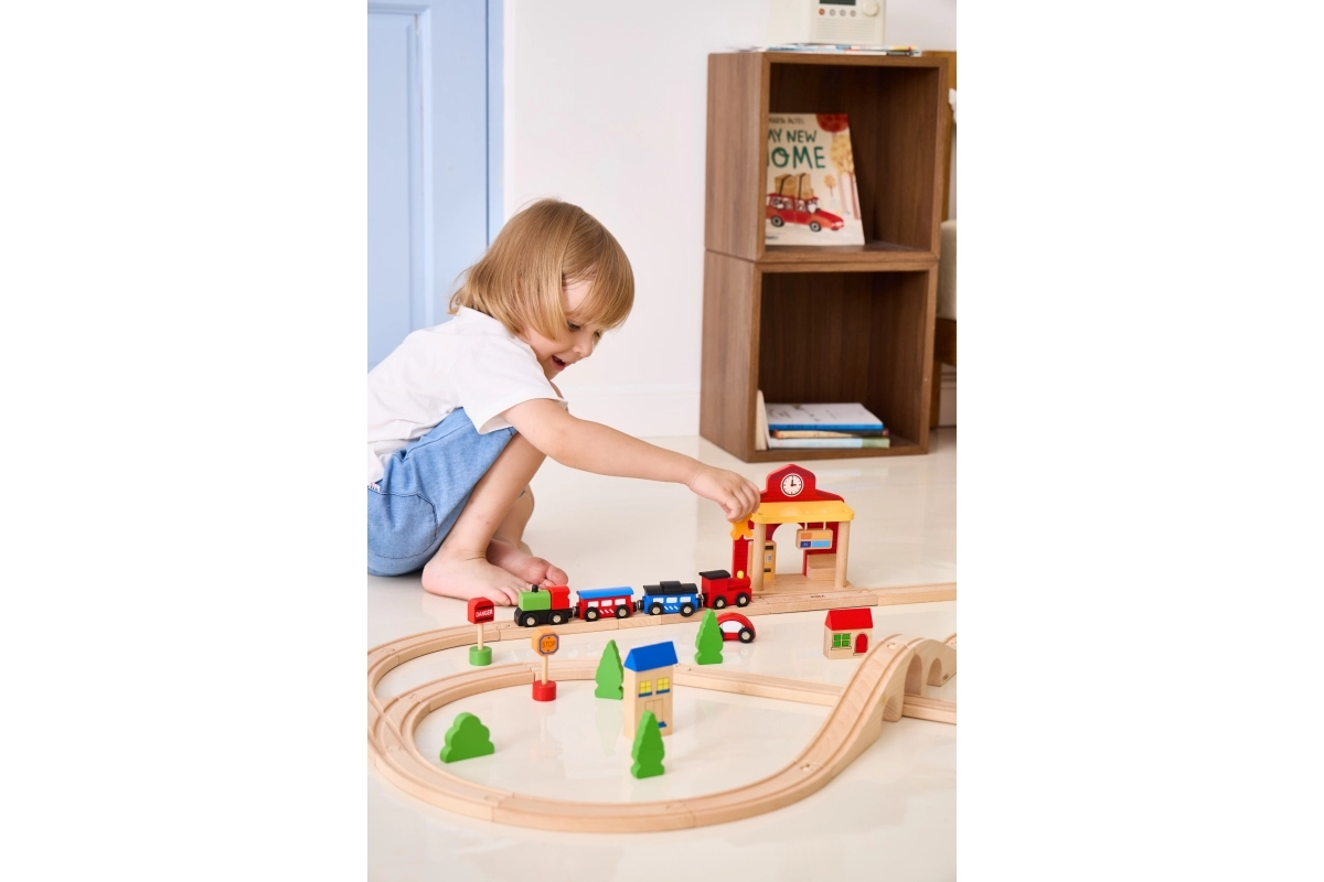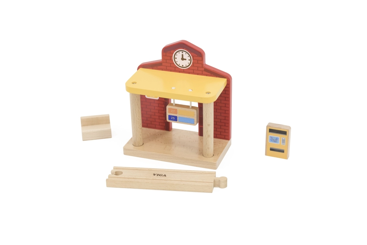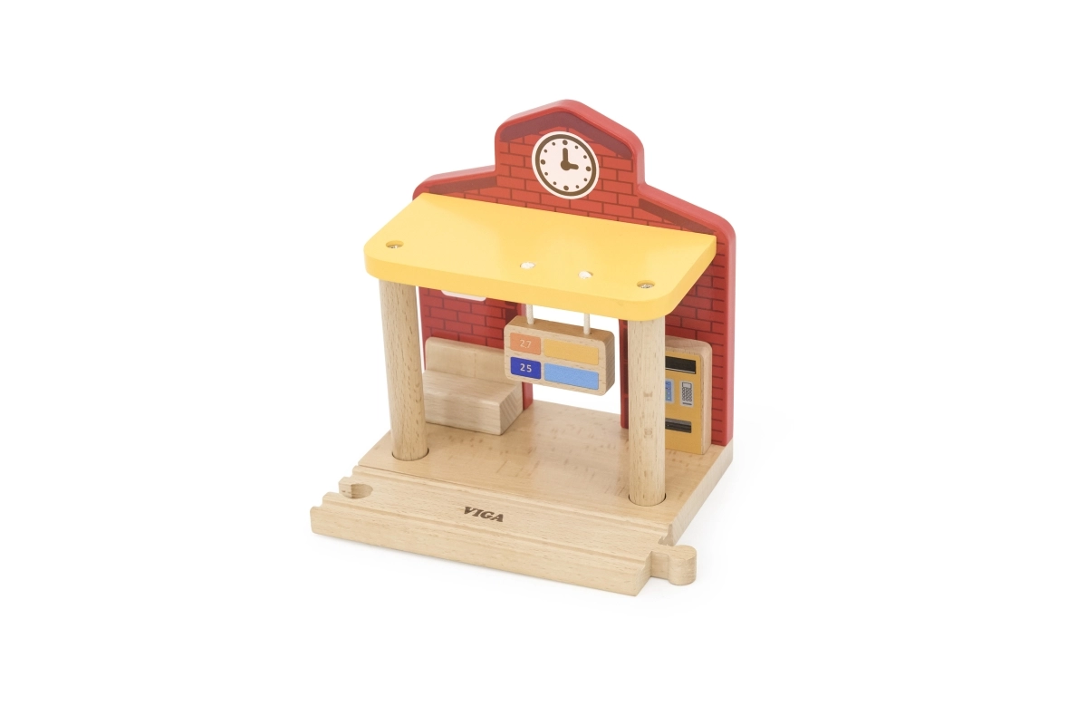 La estación es ideal para escenas infantiles, desde la venta de billetes hasta las llegadas y salidas de trenes. Las dimensiones están pensadas para ajustarse fácilmente a la mayoría de superficies de juego y ser compatibles con las vías de madera más comunes. El juego favorece la motricidad fina, la coordinación mano-ojo y las habilidades sociales.