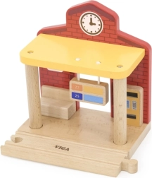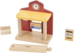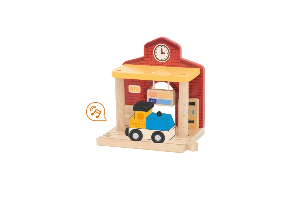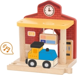 Completa tu circuito de tren de madera con una estación compacta y detalles realistas. La sólida estructura de madera, el reloj legible y la marquesina crean una auténtica atmósfera de estación ferroviaria. Los efectos integrados a pilas realzan cada parada y fomentan el juego interactivo.