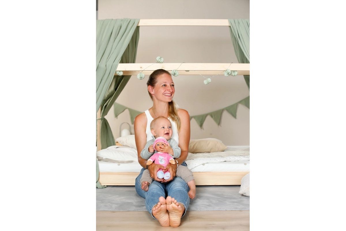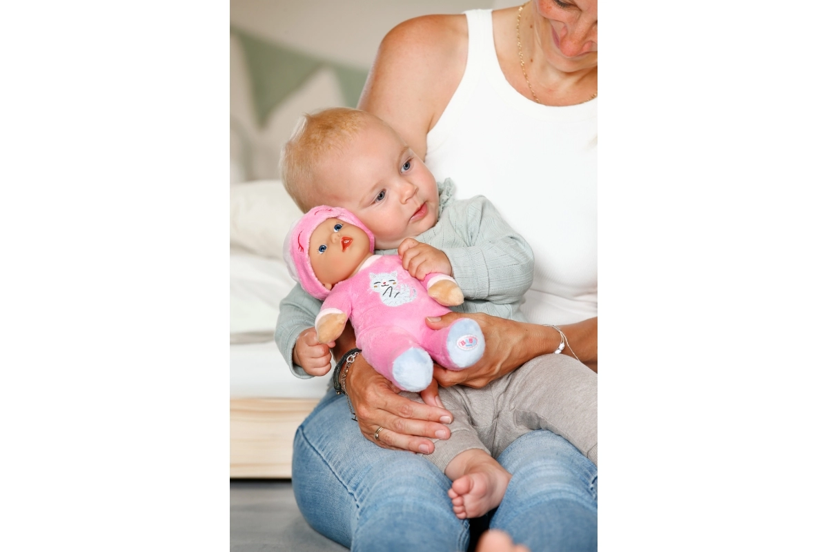 El pelele rosa está decorado con un bordado de un simpático amigo animal y un gorrito a juego con estampado floral. La muñeca se sujeta fácilmente con las manitas, ideal para el cochecito, la cuna y los viajes. El práctico cuidado encantará a las familias: el juguete puede lavarse sencillamente a mano a 30 °C.