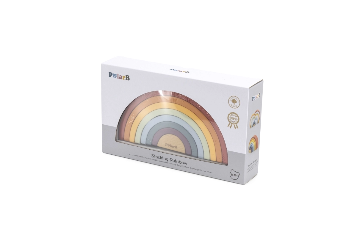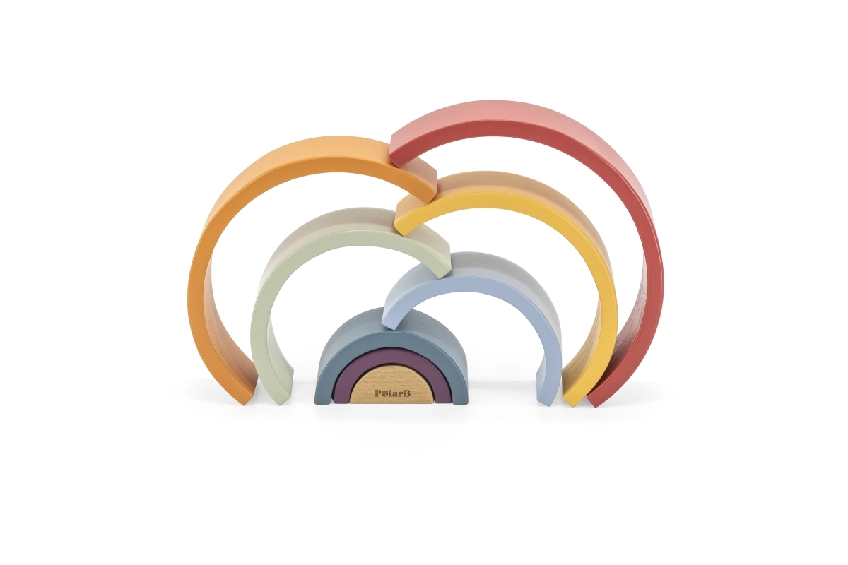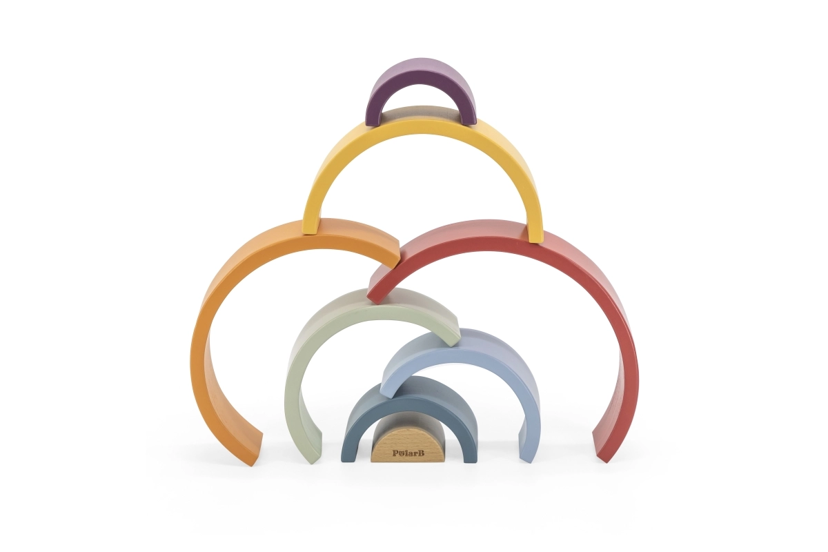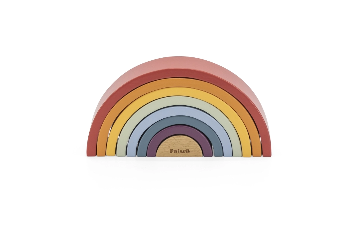 El arcoíris de madera PolarB es un rompecabezas de diseño que crece con el niño. Siete arcos de colores y una pieza interior con logotipo permiten construir arcoíris, puentes, cercados, pistas para cochecitos o torres de equilibrio. El juego desarrolla de forma natural la imaginación, la paciencia y la percepción espacial.