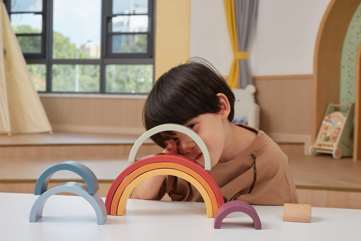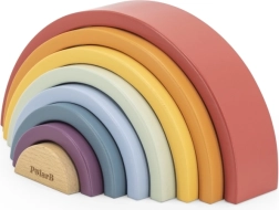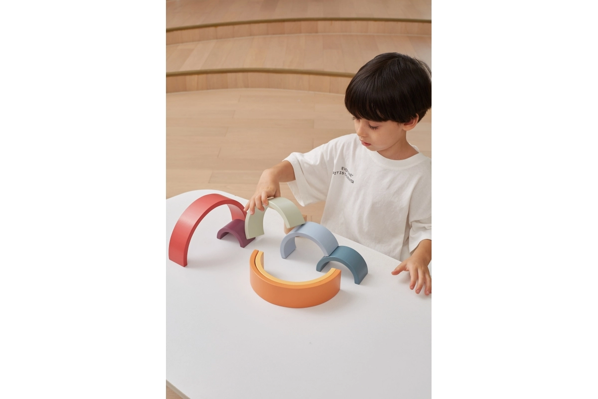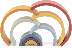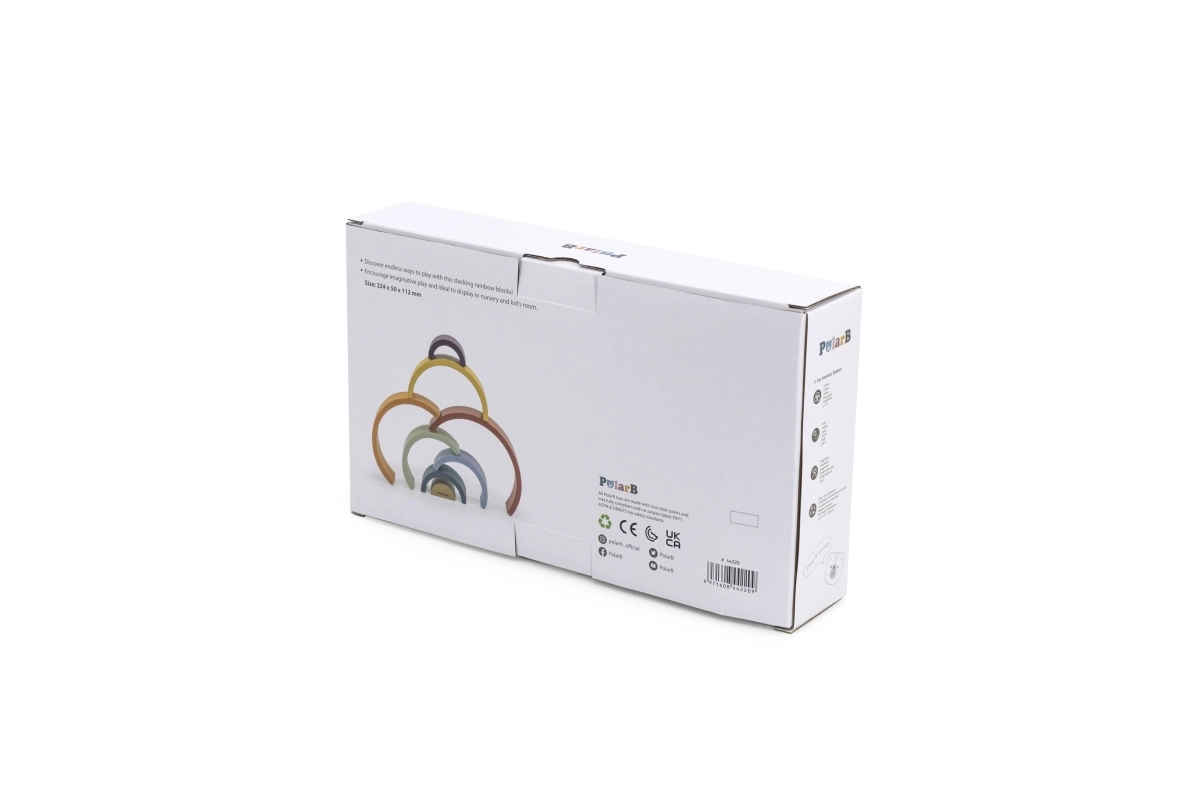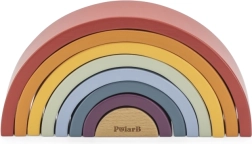 El arcoíris de madera PolarB es un rompecabezas de diseño que crece con el niño. Siete arcos de colores y una pieza interior con logotipo permiten construir arcoíris, puentes, cercados, pistas para cochecitos o torres de equilibrio. El juego desarrolla de forma natural la imaginación, la paciencia y la percepción espacial.