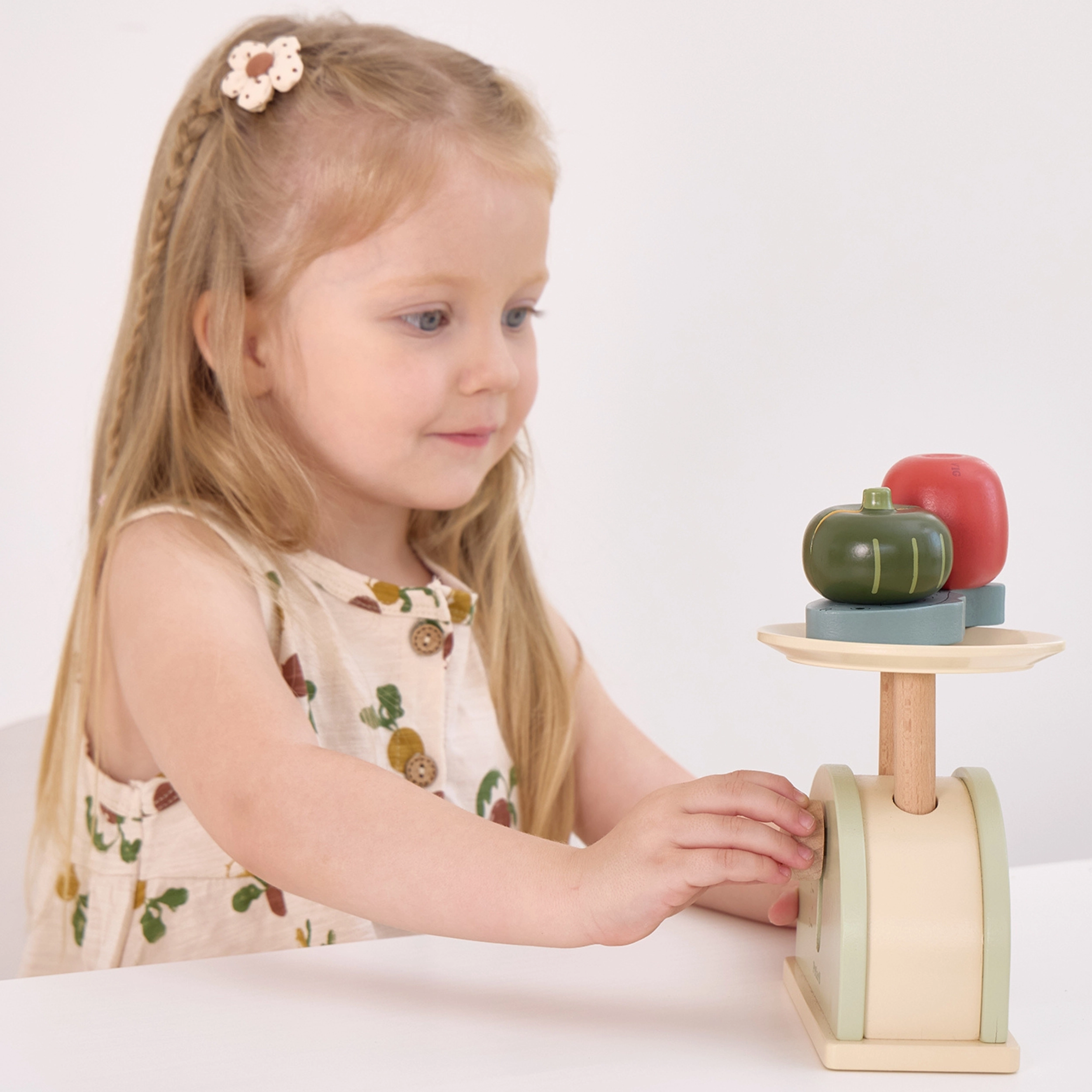 Fomenta la imaginación y las habilidades sociales. Los niños pueden “pesar” frutas y verduras y crear sus propias historias y escenas.