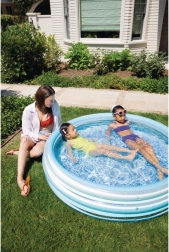 La piscina infantil inflable azul ofrece un refresco agradable durante los días calurosos. La estructura estable de tres anillos inflables garantiza firmeza y bordes suaves, mientras que el suelo de PVC acolchado es agradable al tacto y reduce el deslizamiento.