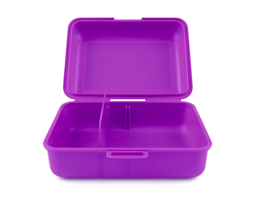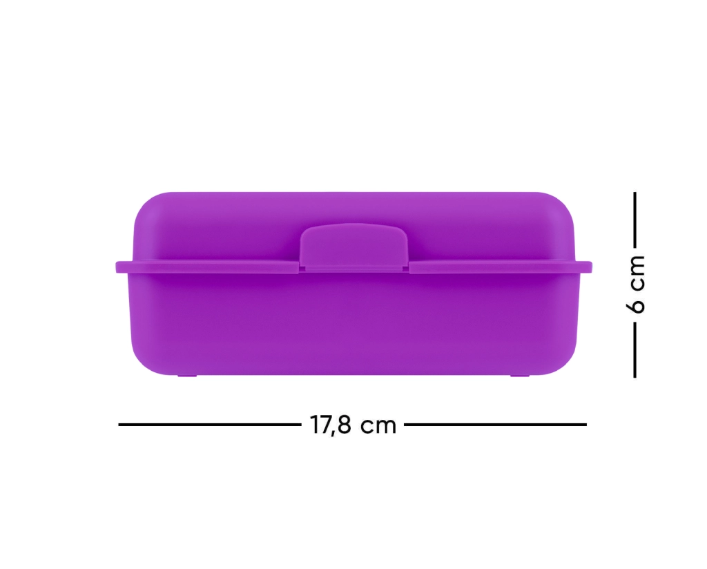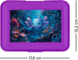 Elegante caja morada con motivo de ajolote que aporta un toque divertido a tus comidas.