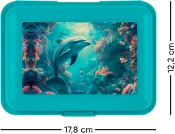 La caja para almuerzo está adornada con un diseño colorido y divertido de un delfín y un arrecife de coral, que atrae a todas las edades.