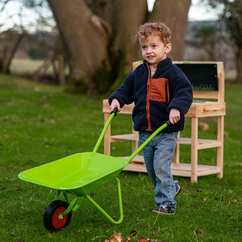 La carretilla infantil está fabricada con materiales metálicos de alta calidad que garantizan estabilidad y durabilidad.