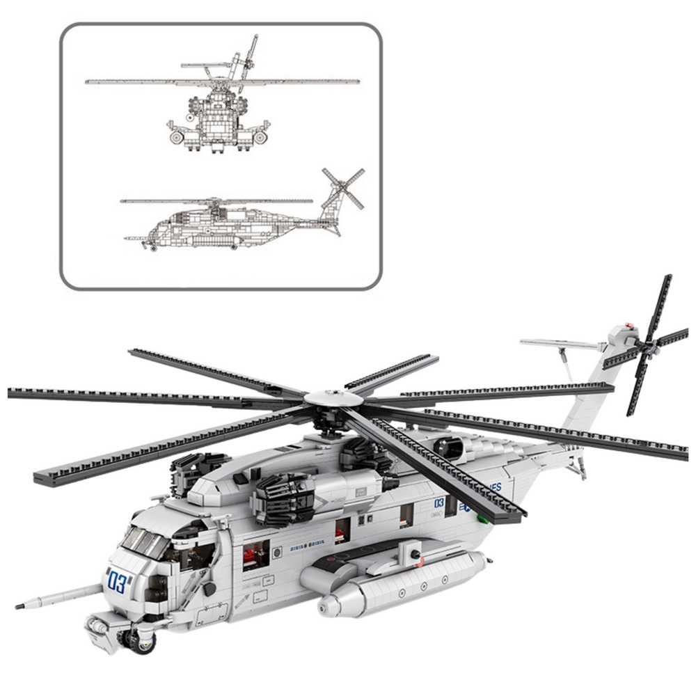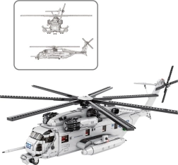 Realista maqueta de helicóptero de transporte CH-53 con 2192 piezas, ideal para aficionados a la aviación y a los modelos técnicos. Ofrece detalles fieles, grandes dimensiones, estructura estable y elementos móviles: rotores giratorios, puertas abatibles e interior detallado.