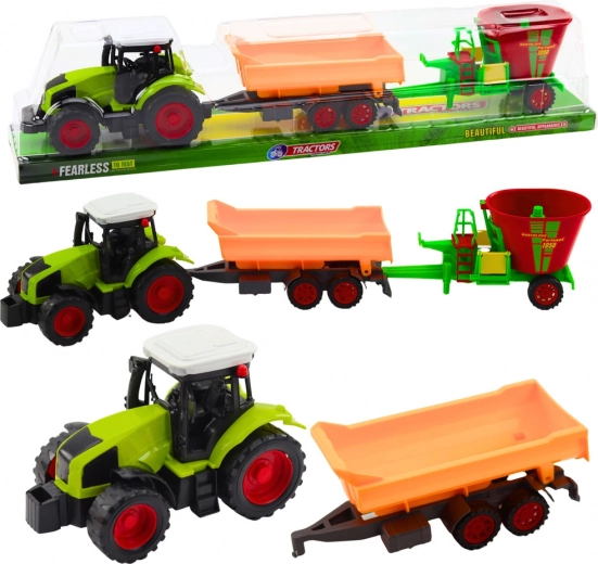 - Tractor verde, remolque naranja (volquete), carro de forraje rojo‑verde