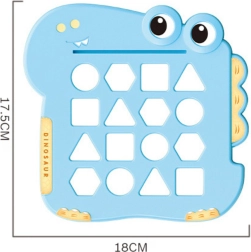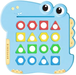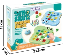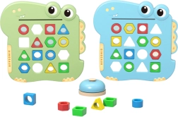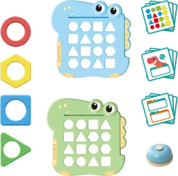 El set incluye dos tableros de dinosaurio, un conjunto de formas geométricas de colores, 48 cartas modelo y una campanilla para una emocionante partida a dos. Materiales resistentes, bordes suaves y colores intensos favorecen una manipulación segura y agradable.