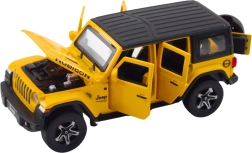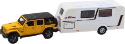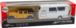 Modelo metálico realista de coche todoterreno con caravana a escala 1:32 que ofrece construcción metálica, efectos de luz y sonido, mecanismo de retrofricción (pull-back) y puertas abatibles. Ideal para jugar y coleccionar, incluye baterías.