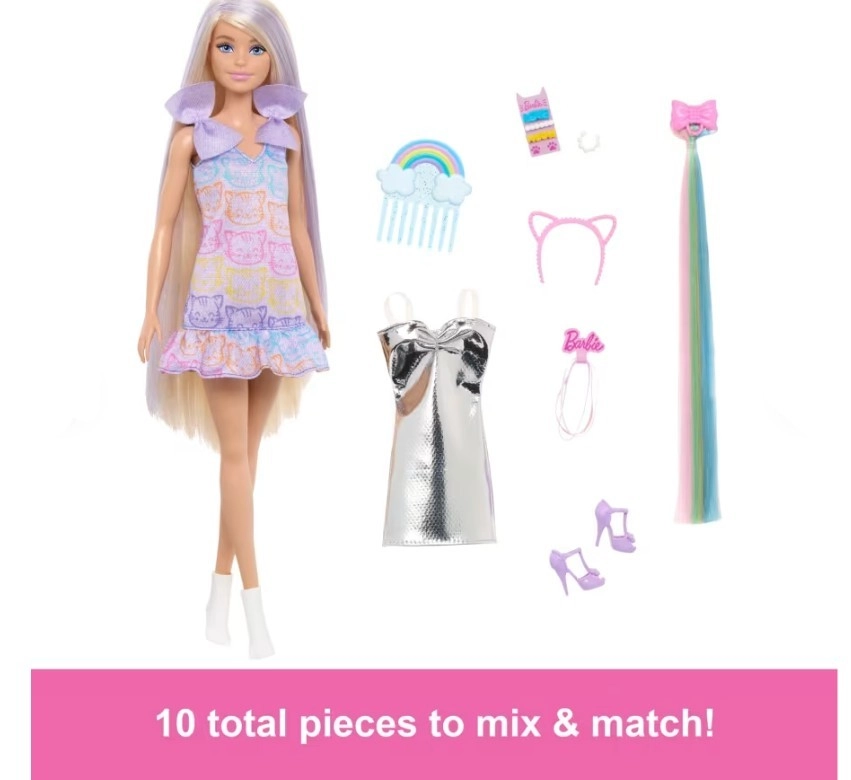 - Los accesorios incluyen un clip con cabello arcoíris, una diadema con orejitas de gato, un set de gomitas y un set de pasadores para el cabello.