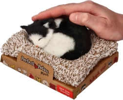 Regálate a ti o a tus hijos esta gata Perfect Petzzz blanco y negro, que descansa plácidamente en su camita. Es una excelente opción para quienes desean una mascota pero no pueden o no quieren tener un animal real. Gracias a su agradable material y acabado realista, transmite una sensación muy calmante.
