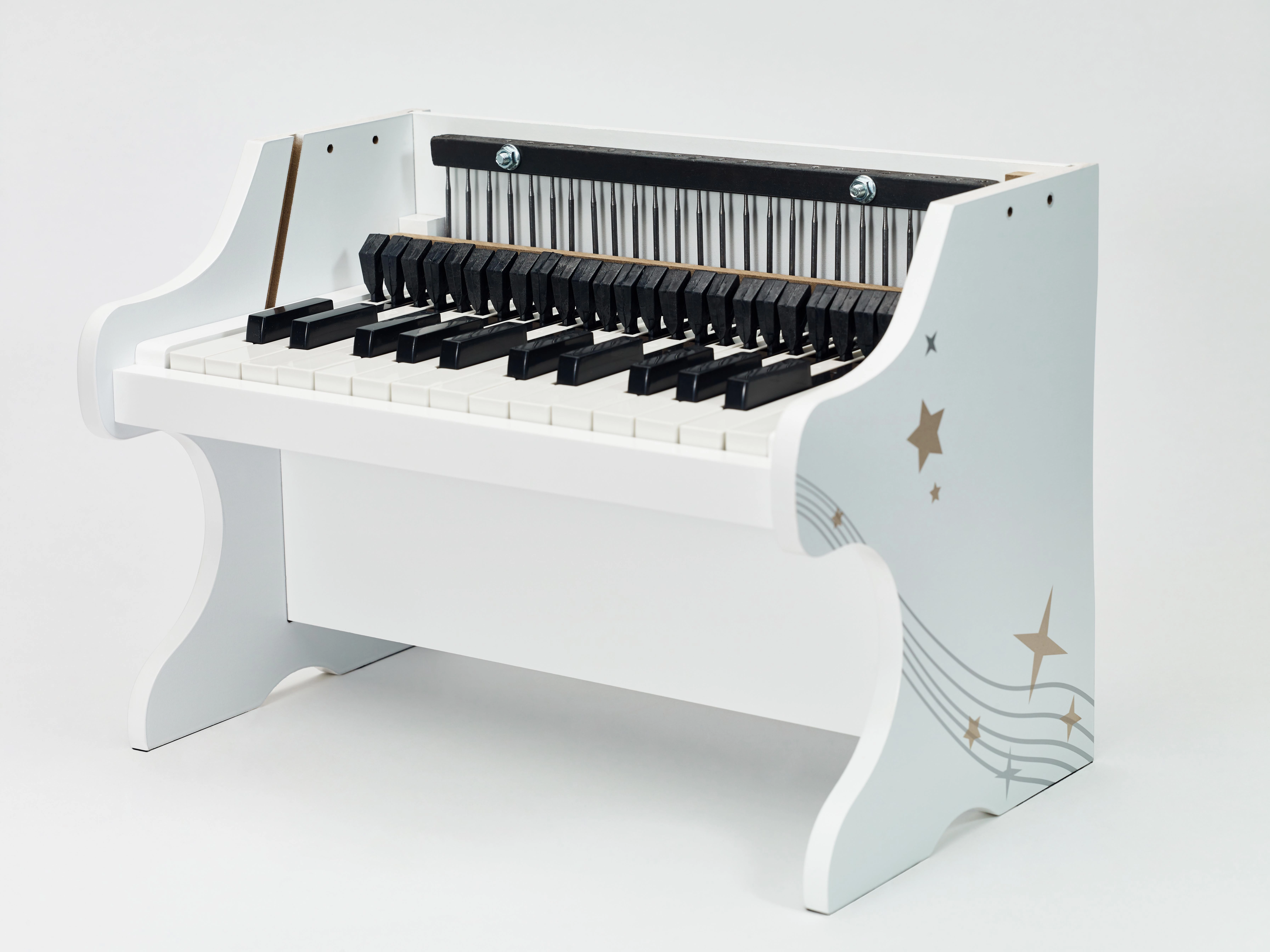 Estructura de madera resistente con barniz blanco no tóxico que garantiza durabilidad y seguridad para el juego diario de los pequeños músicos.