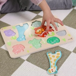 Las piezas de colores con forma de animales motivan a los niños a encajar y ayudan a desarrollar la motricidad fina y la coordinación ojo–mano desde los 18 meses.