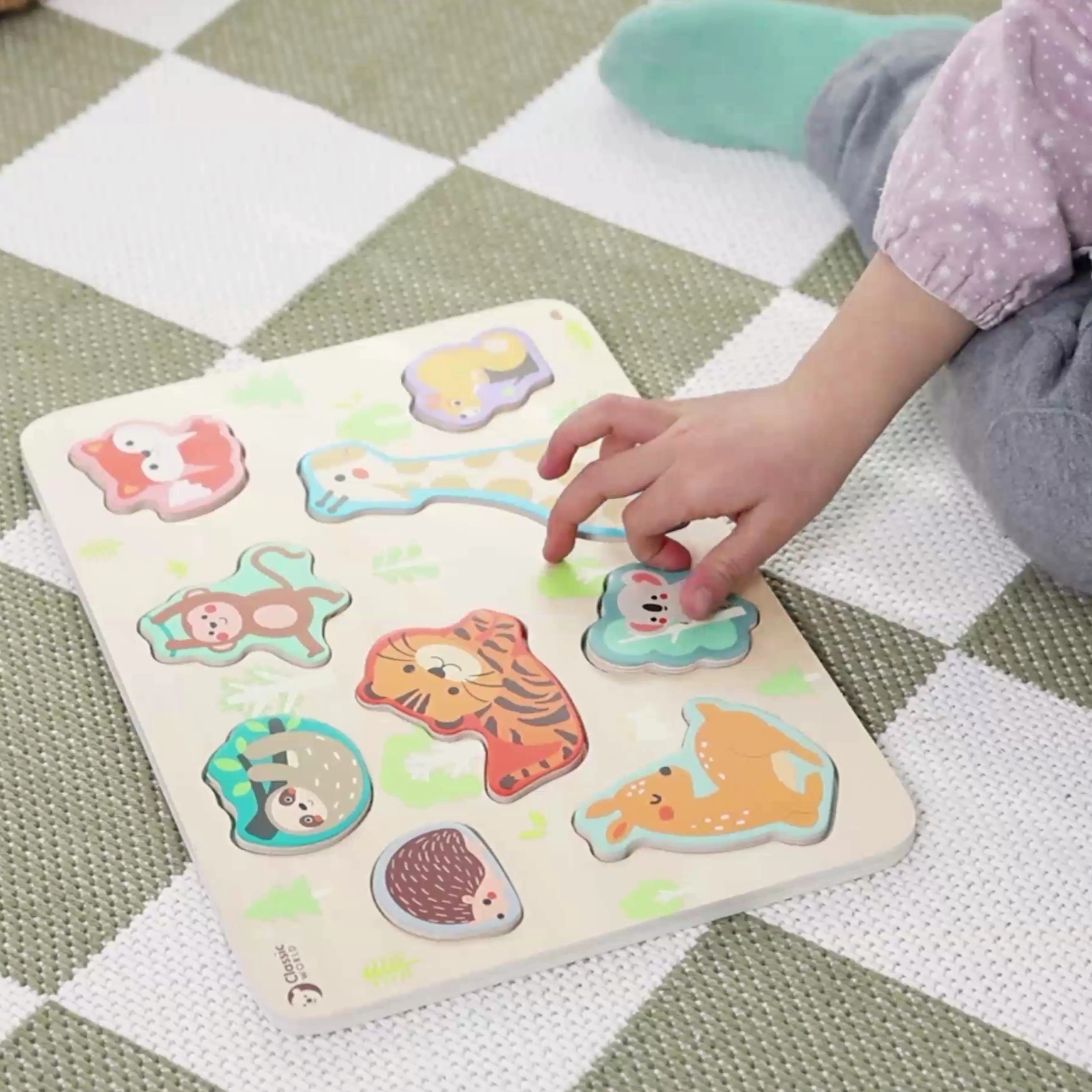 Descubre el divertido clasificador de madera con animalitos de CLASSIC WORLD, que enseña a los niños a partir de 18 meses a reconocer formas y colores. Las piezas de colores como la jirafa o el zorro se colocan en los huecos correspondientes del tablero, desarrollando de forma natural la motricidad fina, la coordinación ojo–mano y el pensamiento lógico.
