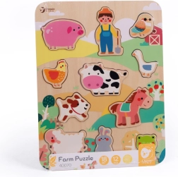 Gracias a su robusta construcción de madera y a los bordes suaves, el rompecabezas es seguro y agradable al tacto. 12 piezas ofrecen el grado justo de desafío para los más pequeños y brindan mucha diversión repetida. La colorida base con una pintoresca granja invita al juego y desarrolla la imaginación y el vocabulario.