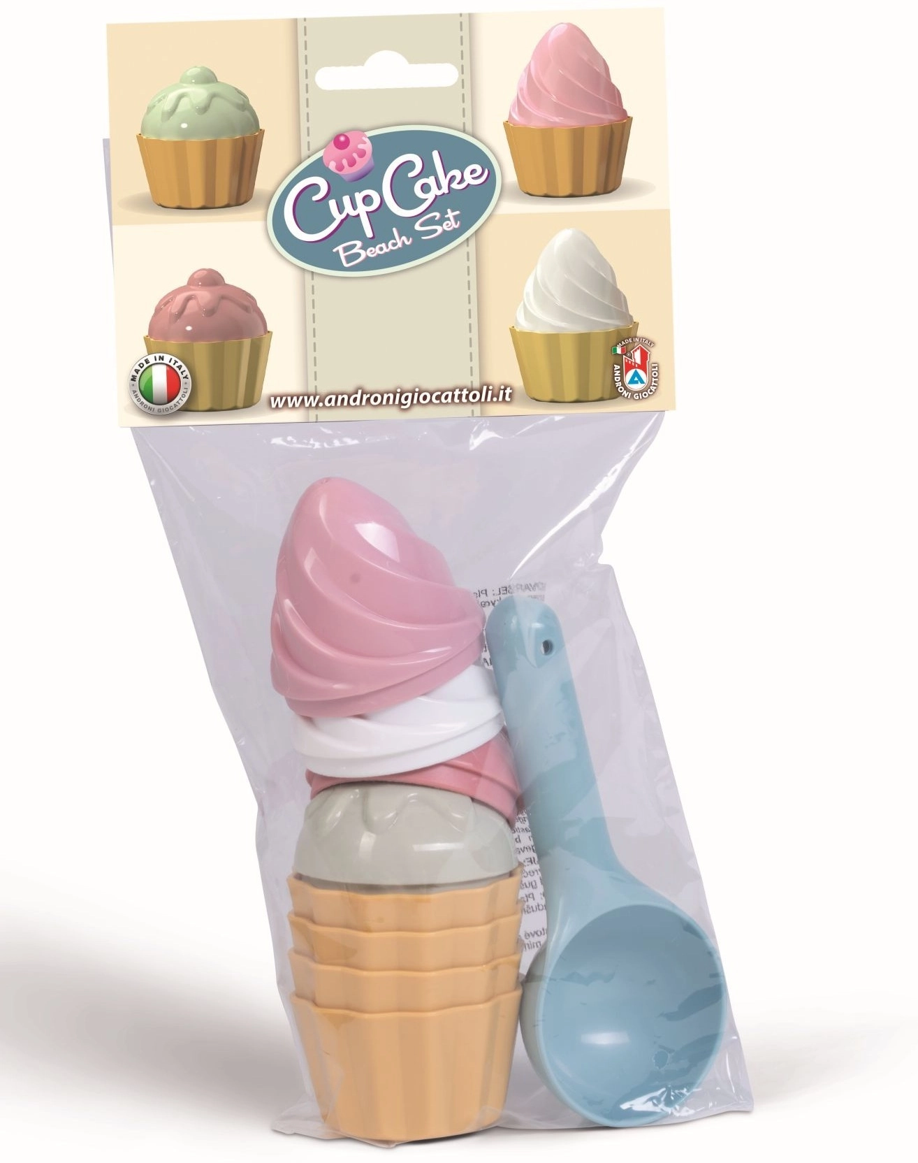 Divertido set de 9 piezas para pequeños pasteleros de delicias de arena. Moldes para arena – pastelitos de la marca Androni incluyen cucharón para helado y 8 moldes para pastelitos. Fabricado en plástico de calidad en Italia, apto para niños desde 10 meses.