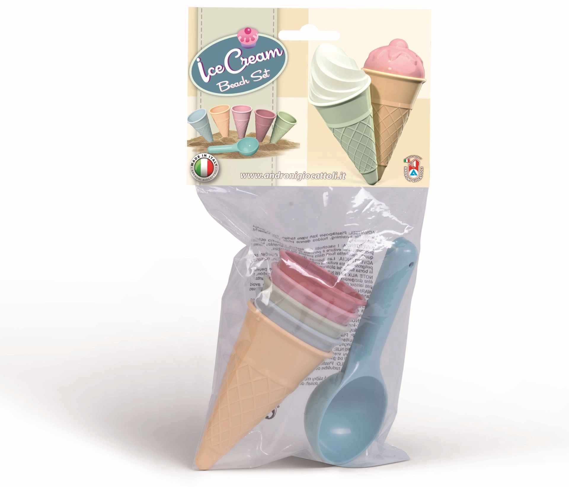 ¡Convierte el arenero en una heladería! El set de Androni aporta mucha imaginación a los niños y ayuda a desarrollar la motricidad fina. Los cinco conos y la práctica cuchara para bolas inspiran juegos de tienda y a compartir con amigos.