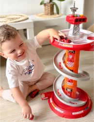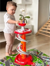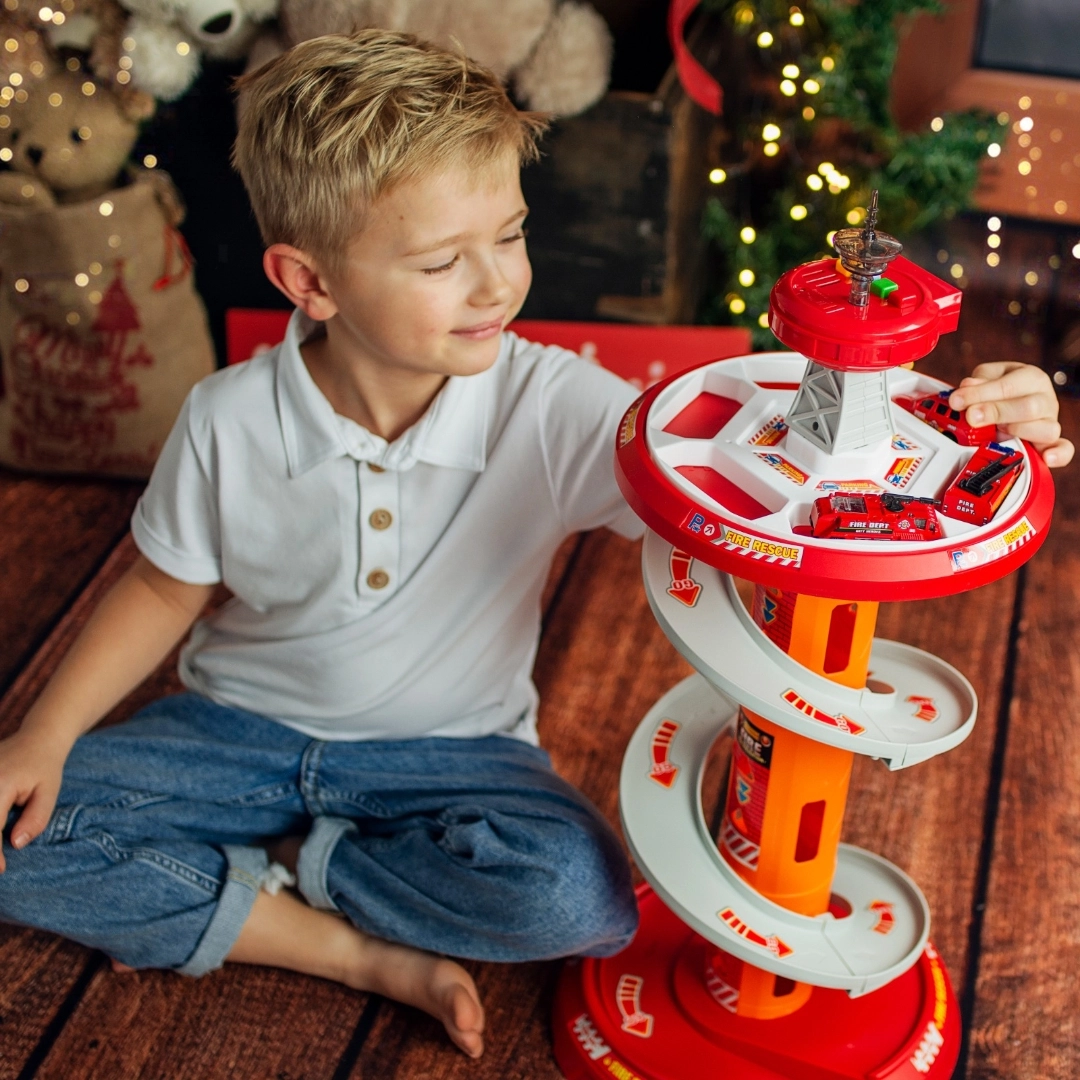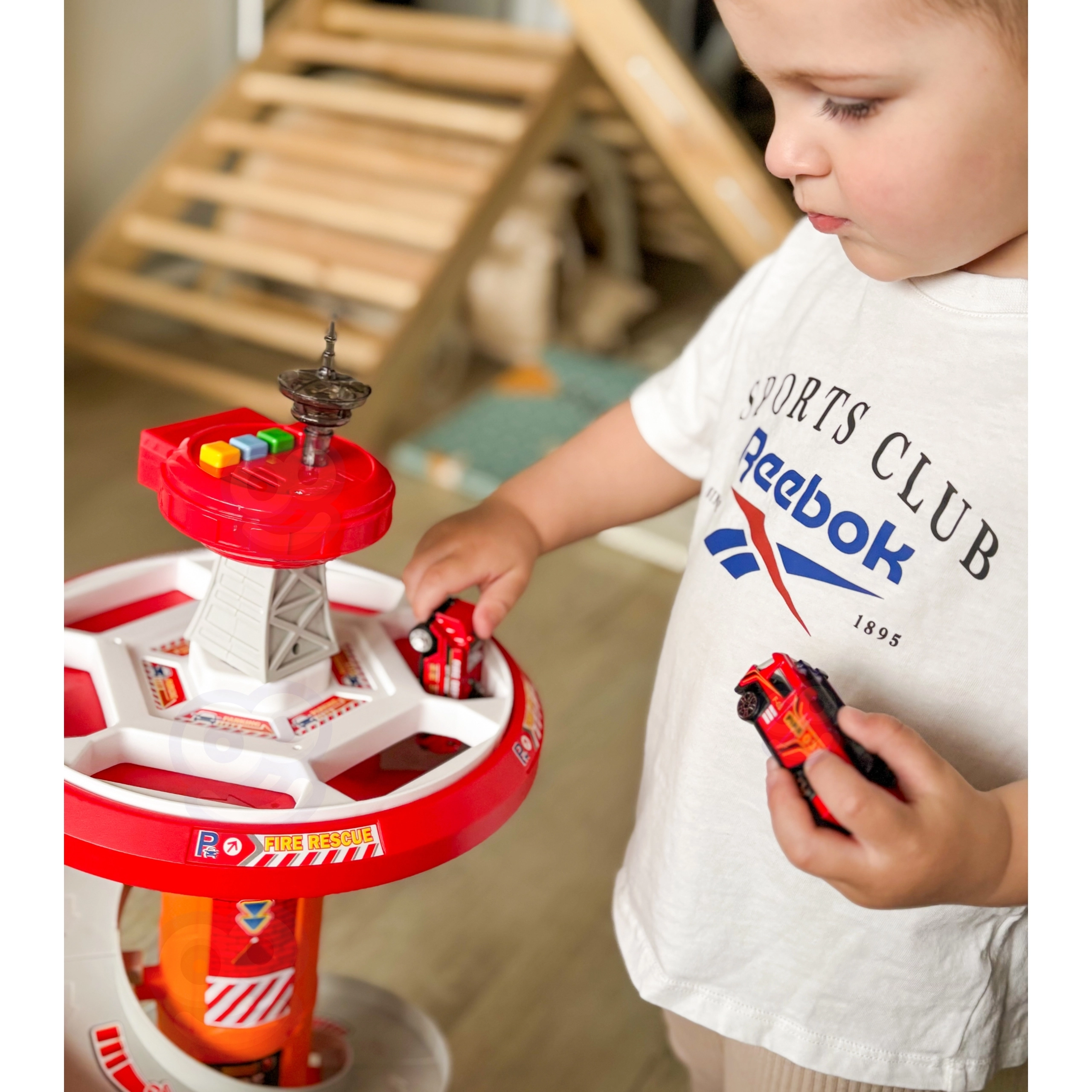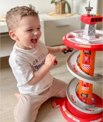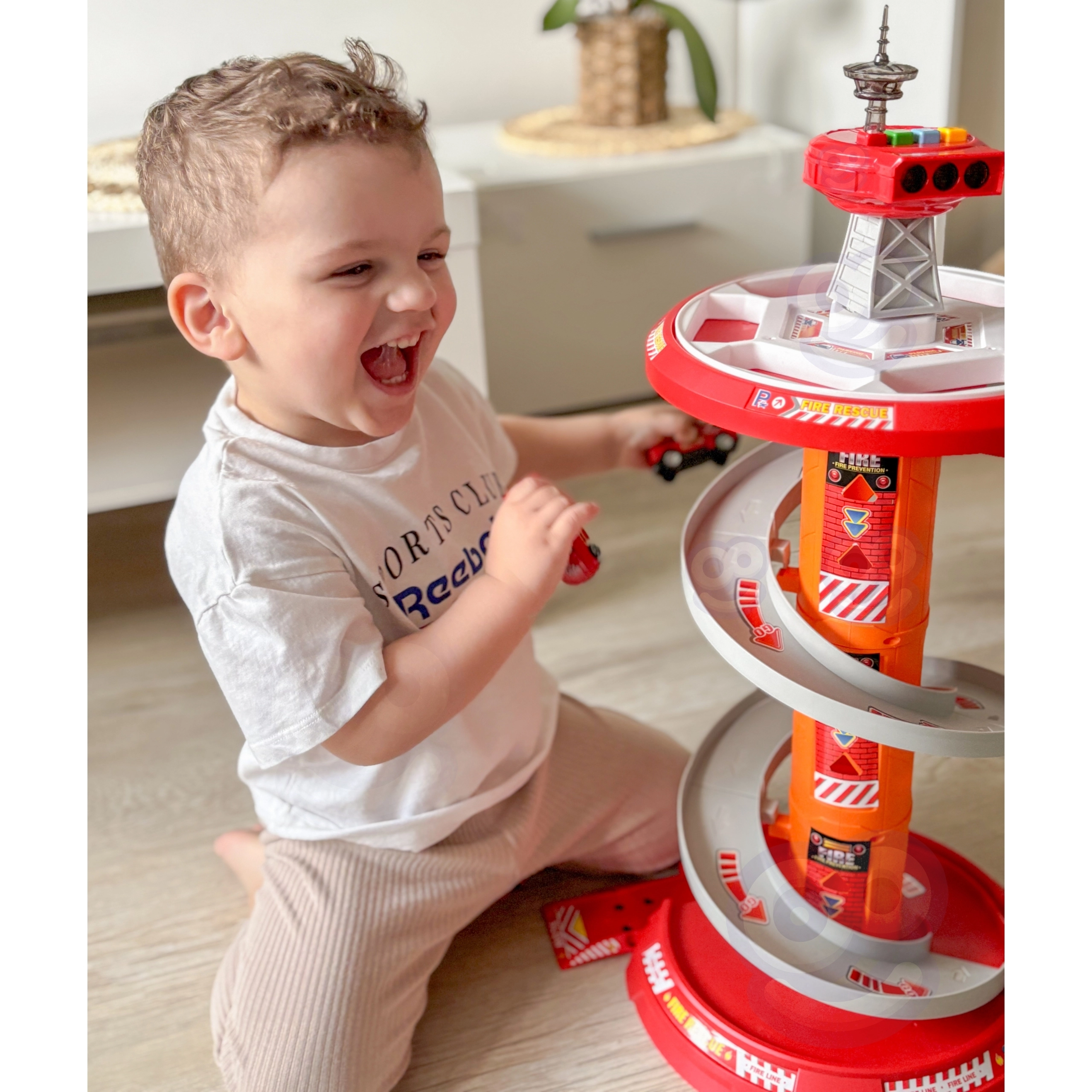 ¡Pon en marcha la diversión con el aparcamiento de bomberos multinivel WOOPIE! La torre estable con rampa en espiral permite un descenso fluido y rápido de los cochecitos desde la parte superior hasta la base. Los niños desarrollan la motricidad fina y la imaginación al salir a la ruta de salida señalizada y seguir las señales de tráfico.